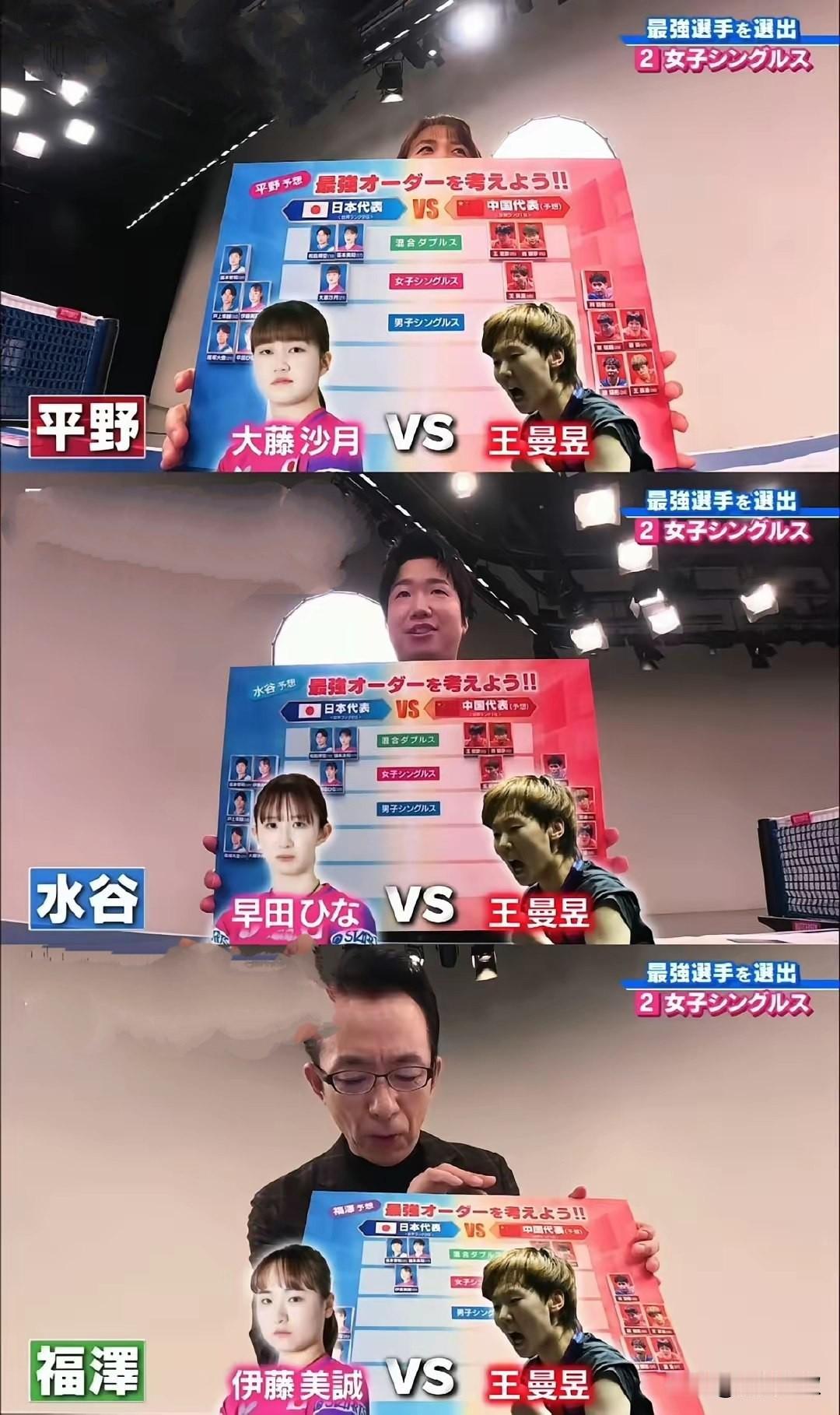 果然!大赛前,日本电视台又整活了! 成都混团月底打响! 日本电视台做了一档节目, 如何打赢国乒? 他们研究重点已经不是孙颖莎, 而是全运会冠军王曼昱。 现在鳗鱼技术又增加了, 让日本队更加担心, 他们模拟派出, 大藤沙月,早田希娜,伊藤美诚, 根据水谷隼的推演, 都是完败! 对了,他们怎么不模拟, 让张本美和对战王曼昱?[呲牙]