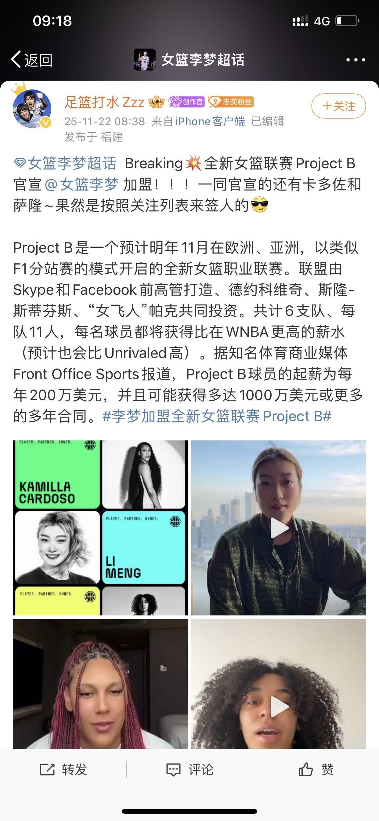 女篮李梦已确定加盟海外联赛! 真是一个好消息啊! 联赛的名字叫做Project B。 这是一个全新的职业女篮联赛,时间是2026年11月份开启 而且是以分站形式走向欧洲、亚洲等多地进行 这个联赛的是由原本出自Skype和Facebook的高管所支持打造的,再加上德约科维奇、斯隆-斯蒂芬斯、“女飞人”帕克等人的投资,从而形成一支全新的顶级女篮职业联赛。 真的应了那句话,是金子总会发光的,哪怕李梦已经30岁了,可她还是能得到女篮世界顶级圈子的青睐 这就是作为两度获得亚洲女子篮球年度最佳运动员称号的魅力和实力所在!
