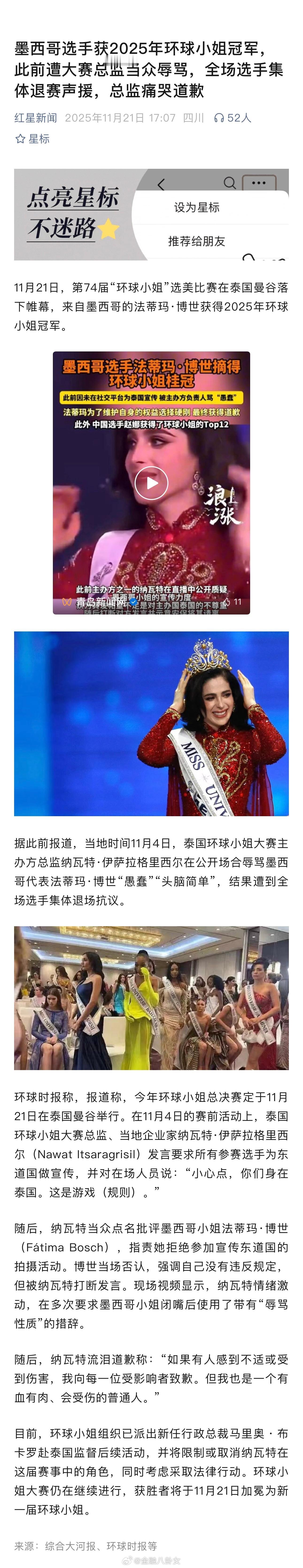 墨西哥选手获2025年环球小姐冠军,此前遭大赛总监当众辱骂,全场选手集体退赛声援,总监痛哭道歉