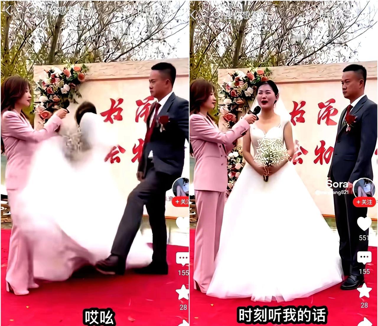 新郎那一脚踹出去的时候, 我真觉得全场空气都冻住了! 新娘直挺挺摔在台上,新郎 扭头就走,连回头都没回头——就因为主持人问婆媳关系, 她居然说“婆婆得听我的,我骂狗她不敢撵鸡”。咱先不说孝顺不孝顺, 说话总得看场合吧?婚礼上对着所有亲友踩婆婆,这哪儿是情商低, 分明是打心底没把长辈当回事儿!心术不正还拎不清,真要是结了婚, 家里能有一天安生日子?新郎踹人确实不对,方式太冲动,但说实话, 总比那些忍气吞声到最后崩溃的强。这新娘到底是喝大了还是没家教, 能说出这么没分寸的话?早点分开真不是坏事,总比婚后鸡飞狗跳强。 换作你家有闺女这么作,你能忍吗?你觉得这事儿里新郎和新娘谁的问题更大?
