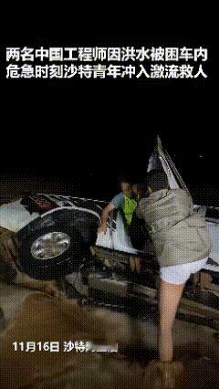 “上人民日报了!”沙特阿拉伯,两名中国工程师不慎被汹涌的洪水困在一辆白色轿车内,车内人员陷入绝境,危急时刻,一名沙特青年冲入急流中,把车门拉开,最后成功将两人救了出来。事后,这名青年获得了表彰。网友:善良无国界! 据人民日报报道,11月16日在沙特阿拉伯,一辆白色轿车被洪水冲倒,两名中国工程师不慎被困在车内,洪水很快淹没了车大半身,眼看轿车就要被洪水冲走, 危急时刻,一名沙特青年看见后,赶忙跑来将车门拉开,在施救期间,他不断安慰他们不要害怕,最后成功将两人救了出来,再次确认车内只有两人后,他才放心带他们离开了现场,而那一句“朋友”,更是让无数网友暖心!就连中国大使馆都表彰了这位沙特青年。 事后,人民日报报道了这危险且感人的一幕,并配文说“被这声“朋友”暖到了!两名工程因洪水被困车内,危急时刻,沙特青年冲进激流救人。中国沙特大使表彰沙特见义勇为青年。为你们点赞!”。 俗话说,救人一命胜造七级浮屠,这不仅仅是救了两个人,更是救了两个家庭,这一行为也更坚定了两国之间的友好关系,中沙友谊长存! 有网友说,“救出第二个人后,他还反复确认车里是不是没人了,很善良也很细心。” 也有网友说,“善良的人无国界,感谢沙特小伙,谢谢你们救了我们同胞,你们辛苦了。” 对此你们怎么看?欢迎评论区讨论。