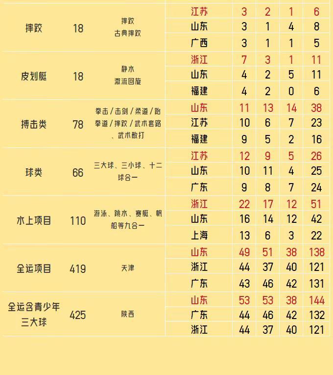 【全运一个班!第一请站起来!】田径第一:广东游泳第一:浙江自行车第一:河南射击第一:浙江体操第一:广东举重第一:福建赛艇第一:辽宁摔跤第一:江苏皮划艇第一:浙江搏击类第一:山东球类第一:江苏水上项目第一:浙江全运第一:山东全运含青少年三大球第一:山东网上数据的差别主要在于含不含去年青少年三大球比赛奖牌,两个榜单的第一都是山东,第二有区别,包含后广东第二,不含浙江第二。