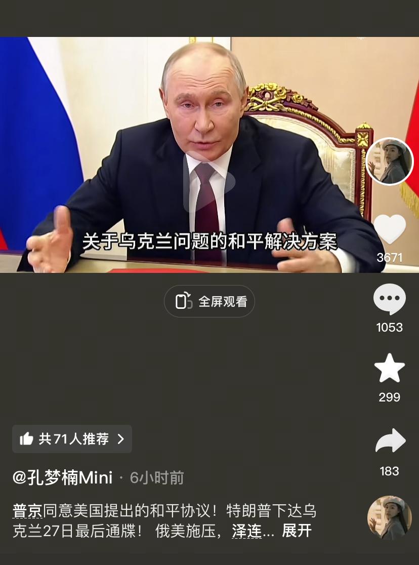 俄方也亮出态度来了,基本同意美方提出的28条,但俄方不会主动推动这个方案,普京又放下硬话了,如果乌克兰拒绝,或者欧洲仍在煽动继续打,那库皮扬斯克的类似事件还会上演。普京劝告乌方与欧方好好想想吧,再打下去丢的更多!
