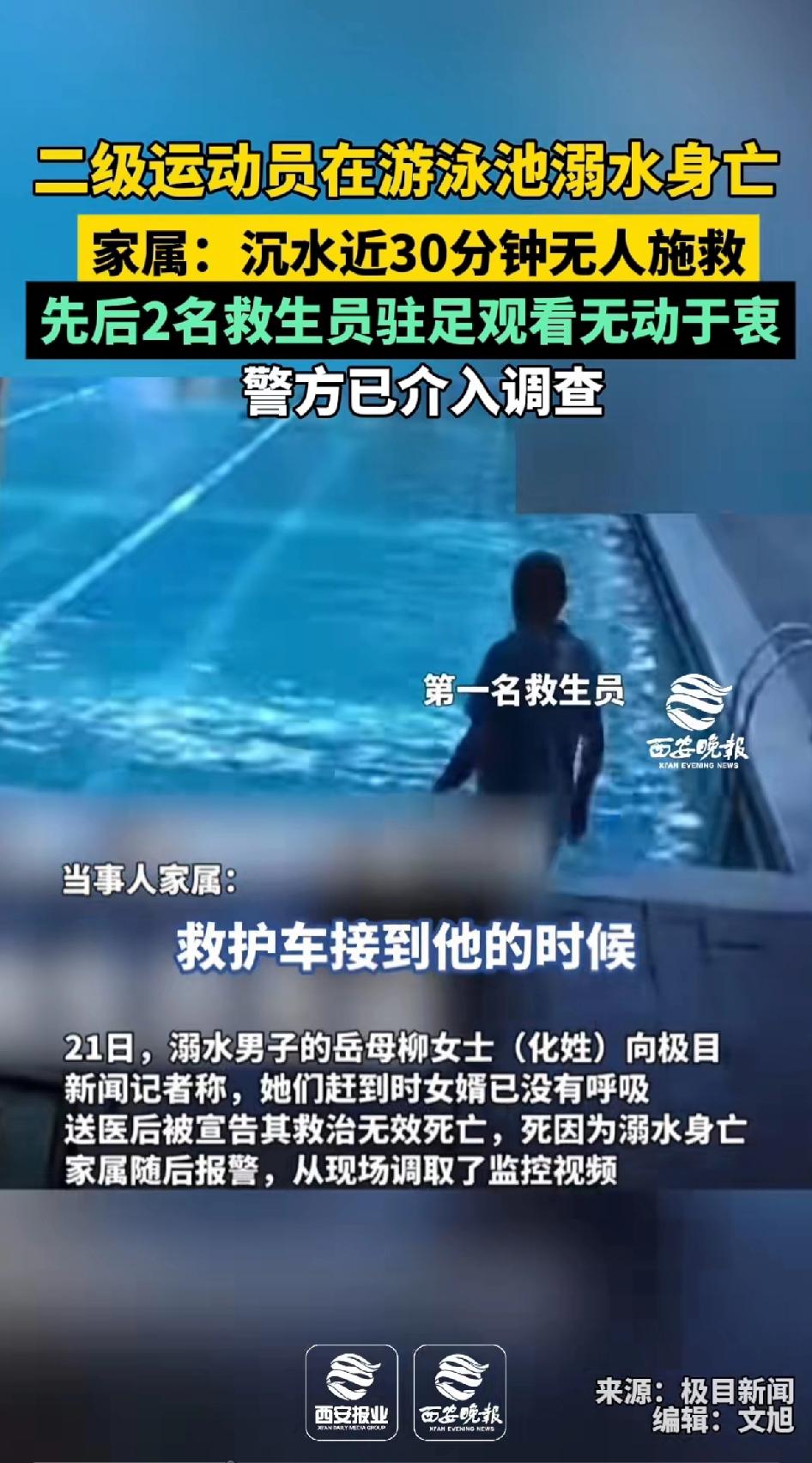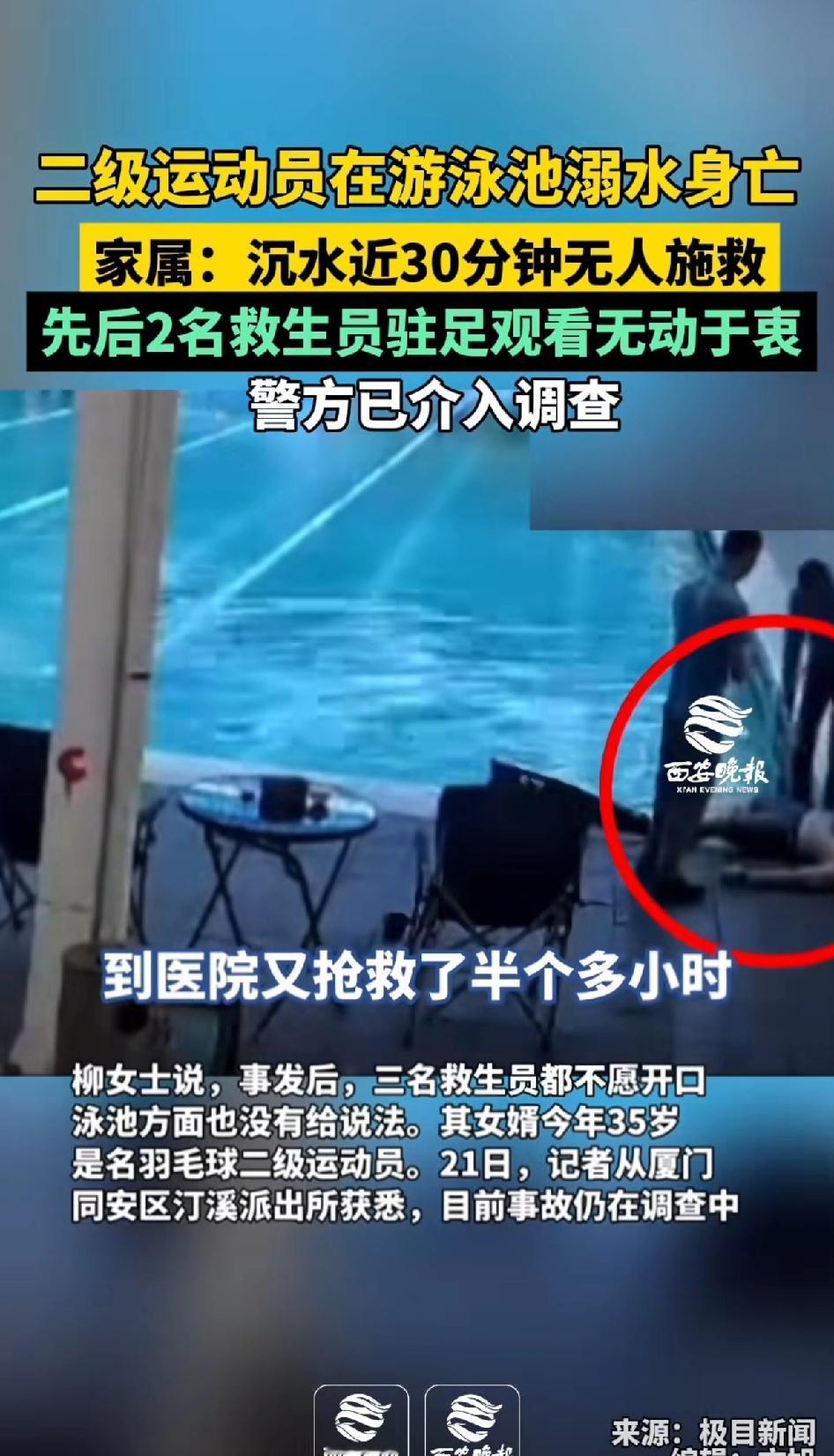 二级运动员在泳泳池溺水身亡!家属:沉水近30分钟无人施救,先后两名救生员驻足观看,却无动于衷。 35岁的羽毛球二级运动员在泳池溺水身亡。家属从监控看到,10点多,男子双脚戴脚蹼游到终点后就一直沉在水里。 落水男子的岳母(柳女士)化名 称他们赶到时女婿已经没有呼吸,送医后被宣告其救治无效死亡。 因为溺水身亡,家属随后报警,从现场调取了监控视频看到 当时有三名救生员在场,一名在沉水处附近观望,约5分钟后另一名救生员过来瞧了一眼便走开。 直到第三名救生员发现不对,三人才用杆子把人捞起,从沉水到被捞出近30分钟。 视频里第二名救生员两手背后,在那里驻足观看,没有一丝着急和抢救措施。 事发后,救生员都不愿开口,泳池也没给说法。这实在让人愤怒,救生员本应保障安全,却如此不作为,希望相关方面给家属一个合理的交代。