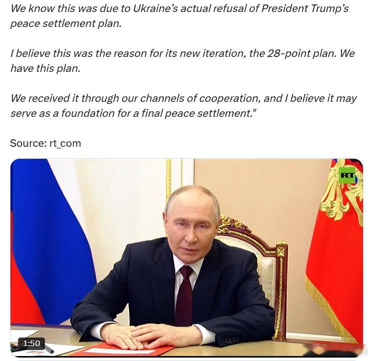 普京:特朗普的28点计划现已成为结束战争的方案“众所周知,特朗普总统为解决乌克兰局势提出的和平计划,在我们阿拉斯加会晤之前就已经讨论过。在此前的讨论中,美方要求我们作出某些让步,以显示他们所谓的灵活性。我们在阿拉斯加会晤的主要目标,是在安克雷奇的谈判中确认,尽管我们方面存在某些问题和复杂情况,但我们同意这些建议,并准备展示所要求的灵活性。我们详细告知了全球南方的所有伙伴和朋友,包括中国、印度、南非、巴西,以及集体安全条约组织(CSTO)国家。所有朋友和伙伴都支持并维护了这些协议。正如我们在阿拉斯加会谈后所看到的,采取了某种暂停。我们知道,这是因为乌克兰实际拒绝了特朗普总统的和平解决方案。我相信这也是其新版本——28点计划——产生的原因。我们已经拿到了这份计划。我们是通过合作渠道收到的,我相信它可以作为最终和平解决的基础。”