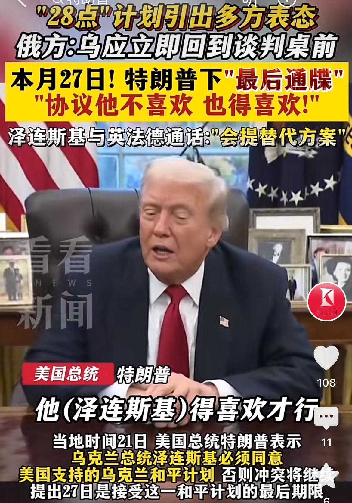 近日,特朗普在白宫回应记者提问时宣称:“美国提出的和平协议,泽连斯基必须接受!要是不接受,美国就会切断所有军事援助,他清楚,这场冲突该画上句号了!”与此同时,特朗普给乌克兰设定的最后考虑期限是27日感恩节之前。 4年时光匆匆而过,无数人员伤亡,财富化为乌有,这场纷争确实也到了该终结的时候。当下的关键问题在于,究竟由谁来承担这一切的代价呢?如何评价欧洲国家对俄乌和平的态度