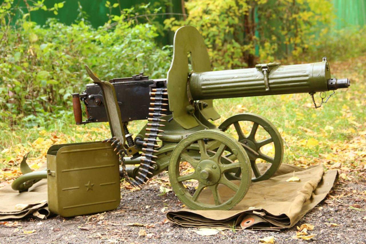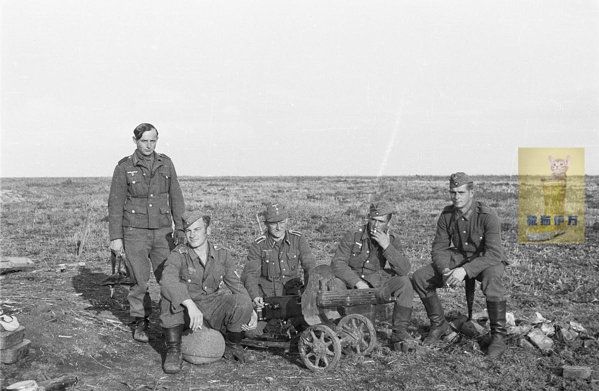 1943年春季,库尔斯克战役爆发之前。一队德军士兵正在检查一挺被遗弃的苏制M1910/30型马克沁重机枪。这挺机枪没有构筑阵地,直接放在地面上。从水冷套筒上的弹痕判断,当时的战斗还比较激烈。 M1910/30型马克沁重机枪(参见图3)是苏联在图拉兵工厂对沙俄M1910型马克沁机枪的现代化改进型号,主要改用更容易生产的索科洛夫轮式枪架,并简化了生产工序。该枪使用7.62×54mm R弹药,通过250发帆布弹带供弹,理论射速500-600发/分钟。水冷套筒是其标志性特征,但一旦被击穿,机枪的枪管就会因失去冷却能力而无法持续射击。