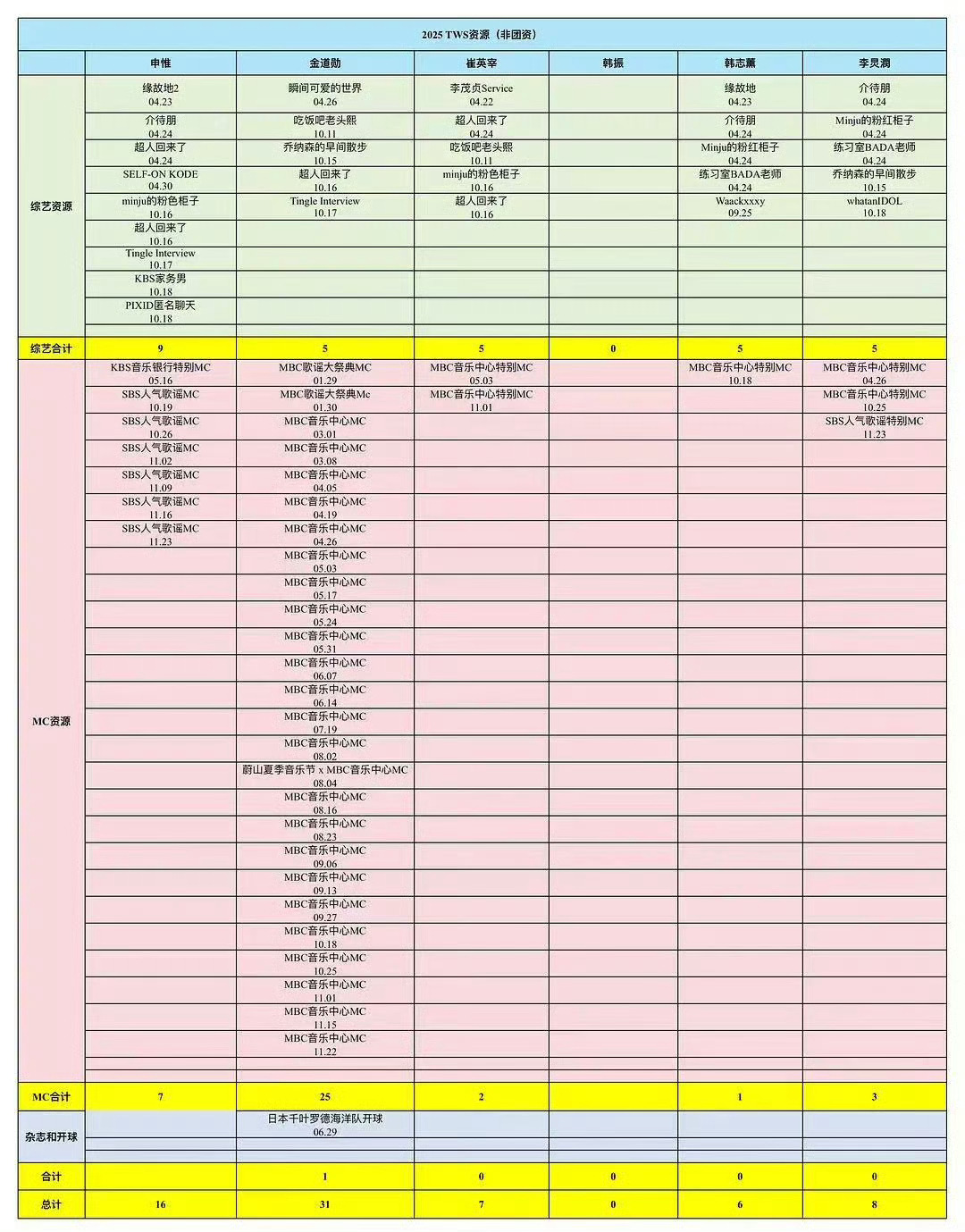 2025 年 TWS 个资拉表(申惟/金道勋/崔英宰/韩振/韩志薰/李炅潣)