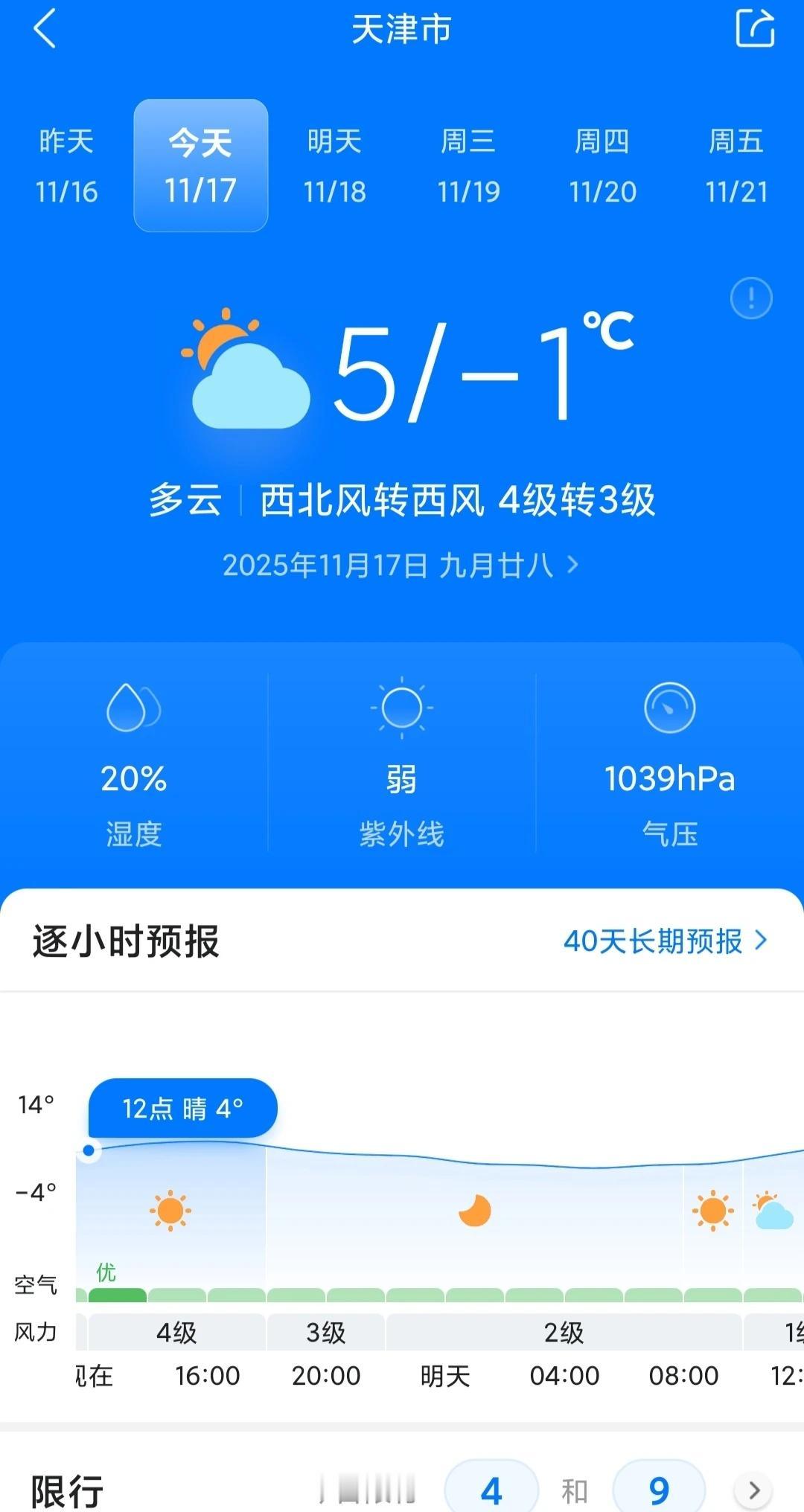 天津今年入冬以来,第一次零下温度 天津今日天气 多云 / -1~5℃ / 西北风4级 / 日出日06:57~16:56 气温过低,特别容易着凉感冒,较不适宜户外运动,建议室内运动。