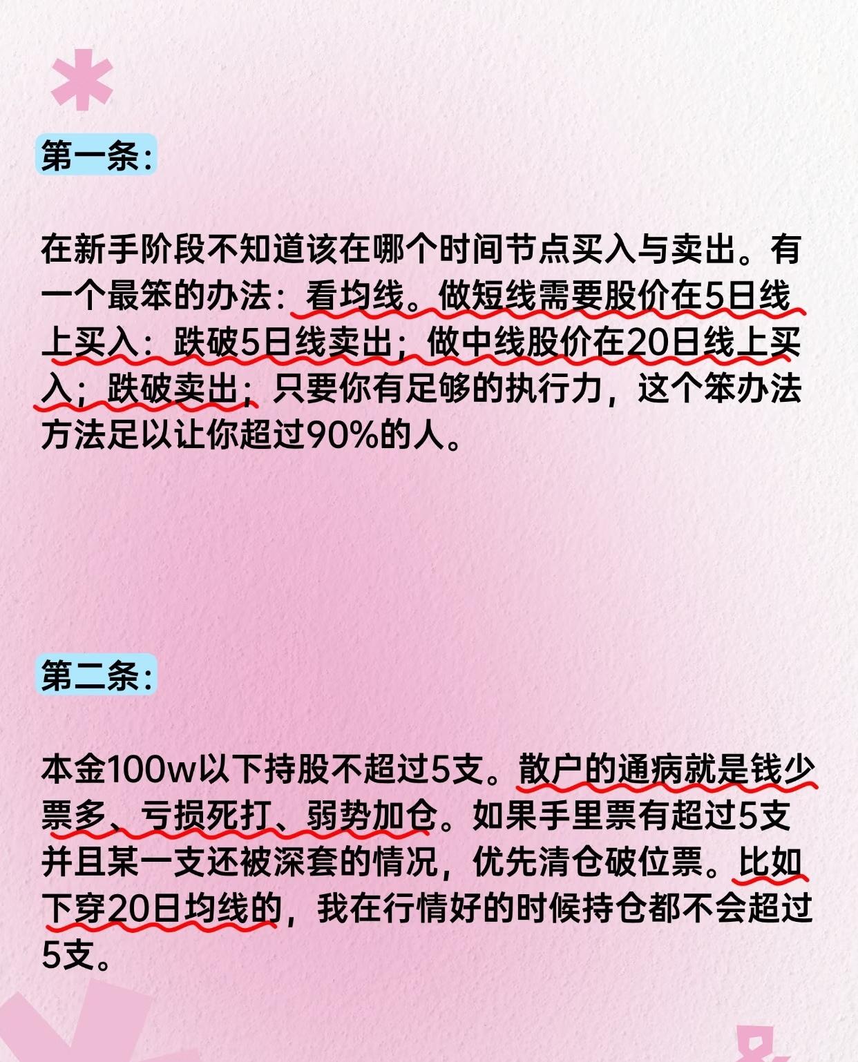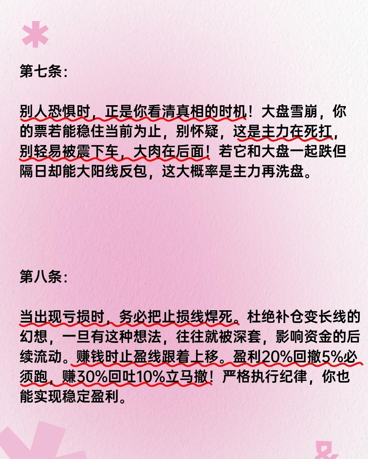 为您整理了一份系统化的股票投资实战建议,涵盖从新手入门到进阶操作的完整策略框架: 一、基础操作原则 1. 均线买卖法则(新手核心工具) - 短线:5日均线为操作线(站稳买入/跌破卖出) - 中线:20日均线为生命线(站稳持有/跌破离场) - 执行要求:严格按信号操作,纪律性决定成功率 2. 仓位控制铁律 - 资金适配模型:▸ 5-8万:单票集中(1支)▸ 18-30万:2支组合▸ 50-80万:3-4支▸ 百万以下:不超过5支(作者实战标准) - 特殊处理:深套股优先清仓破位标的(20日线下穿) 二、进阶操作策略 3. 盈亏管理纪律 - 加仓原则:仅允许盈利加仓,被套禁止补仓(需反向思考建仓意愿) - 反向验证:K线倒置观察法识别真实支撑压力位 4. 波段操作技巧 - 早盘急跌:若个股热度存疑,观察午后V型反转机会 - 尾盘异动:快速拉升时减仓(次日80%回调概率) - 成交量口诀:▸ 地量阴跌→持续看跌▸ 地量红盘→底部信号▸ 放量滞涨→立即离场▸ 巨量冲高→必然回踩 三、主力行为应对 5. 大盘极端行情处理 - 暴跌护盘识别:个股抗跌/逆势反弹→主力支撑信号 - 洗盘确认:跟跌后次日大阳反包→主力洗盘特征 6. 止损止盈体系 - 亏损管控:固定止损线(建议7-10%),杜绝摊平成本 - 盈利保护:▸ 盈利20%时,回撤5%离场▸ 盈利30%时,回撤10%止盈 - 动态调整:盈利每上新台阶,同步上移止盈位 四、新手特别提示 7. 极简主义生存法则 - 工具选择:初期只需掌握均线系统(5日/20日) - 执行要点:简单规则重复做(效果>复杂指标组合) 8. 风险控制底线 - 单票风险:任何持仓不超过总资金20% - 应急准备:永远保留3个月生活费的现金储备 实操建议: 1. 新手建议从5万元起步,单票操作积累经验 2. 每日收盘后复盘当日操作是否符合既定规则 3. 建立交易日志记录每笔交易的买卖依据和结果 4. 每月回顾执行纪律情况,重点改进情绪化操作 这些经过实战验证的策略,核心在于纪律执行而非技术复杂度。建议选择3-5条最易理解的原则先行实践,逐步建立适合自己的交易体系。市场唯一不变的就是变化,但人性弱点永恒存在,做好资金管理与自我控制即是成功基石。