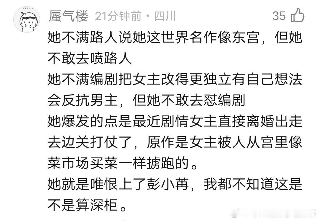 彭小苒硬刚凤凰台上的原作者,维护自己的作品起因于网友吐槽作者虐女,然后作者发数篇
