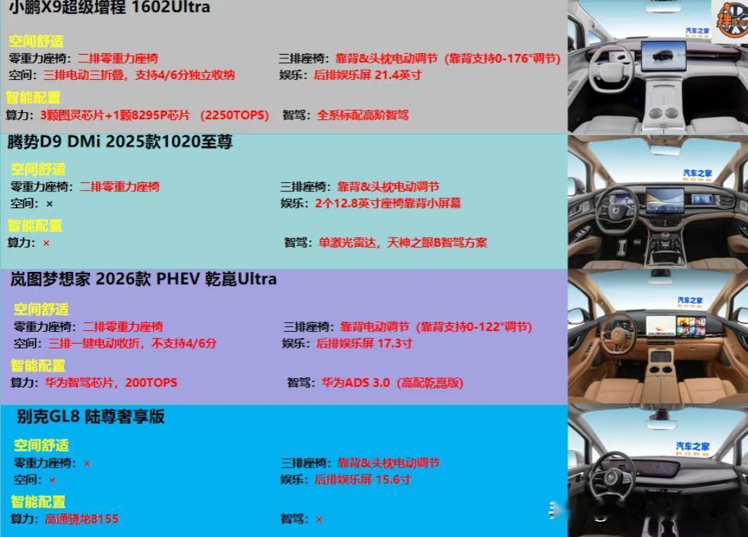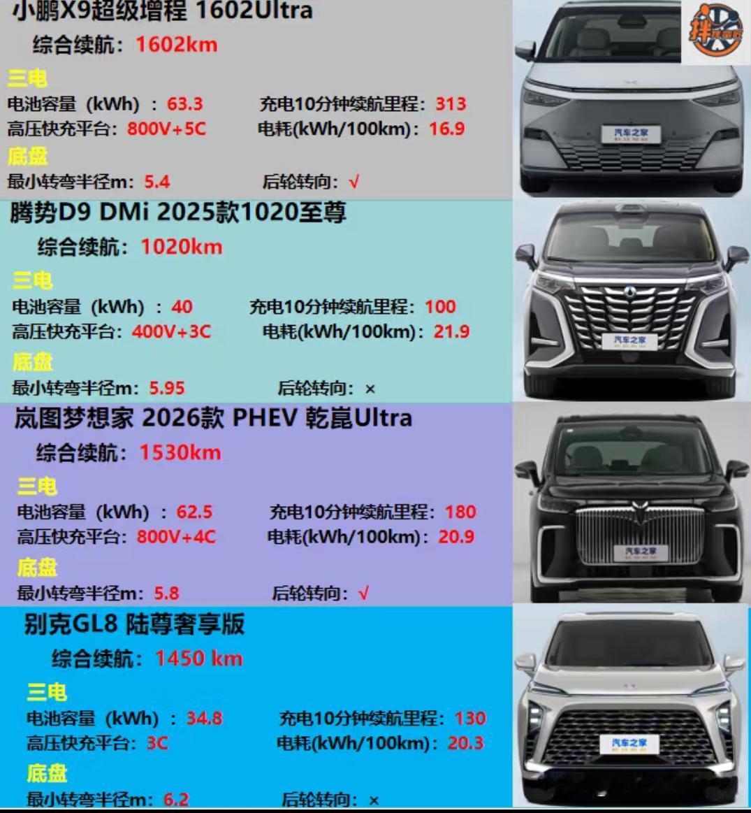 我觉得mpv的空间大小和对外放电的大小才是最重要的。 小鹏X9、岚图梦想家、腾势D9、别克GL8核心差异。 1. 价格与三电 - 小鹏X9:价格32.98万,CLTC综合续航1602km(纯电452km),支持800V超充(10分钟补能313km),电池63.3kWh,无对外放电。 - 岚图梦想家:价格42.99万,CLTC综合续航1503km(纯电350km),800V超充(12分钟补能210km),电池62.5kWh,支持3.3kW对外放电。 - 腾势D9:价格45.98万,CLTC综合续航1020km(纯电190km),400V充电(20分钟补能95km),电池40kWh,无对外放电。 - 别克GL8:价格39.99万,CLTC综合续航1450km(纯电202km),20分钟补能130km,电池34.8kWh,无对外放电。 2. 空间与舒适 - 储物/座椅:小鹏X9支持7个24寸行李箱+三排电动折叠,二排可180°旋转;岚图梦想家仅支持8个20寸行李箱;腾势D9、别克GL8储物能力较弱。 - 座舱配置:小鹏X9配备双拼空调(五温区)、21.4英寸后排屏(0-75°悬停)、27扬声器;其余车型为传统三温区空调,屏幕尺寸/功能更基础。 - 空间拓展:小鹏X9有前6后5压式密封地板、220V外放电;岚图/腾势/GL8无此配置。 3. 操控与安全 - 悬架/通过性:小鹏X9采用全铝双叉臂+五连杆悬架,离地间隙180mm;岚图为双叉臂+五连杆(离地163mm);腾势/GL8为麦弗逊悬架(离地140-143mm)。 - 安全配置:小鹏X9配备9气囊(含二排重力座椅气囊)、2000MPa车身(扭转刚度46000N·m/deg);腾势D9气囊数相同但无二排特殊气囊;岚图/GL8气囊数更少。 4. 智驾能力 - 小鹏X9:搭载3颗图灵芯片(算力2250TOPS),标配全场景智驾、VLA+VLM; - 腾势D9:天神之眼Orin芯片(算力254TOOr),智驾覆盖城市有限; - 岚图/GL8:智驾算力低(岚图200-600TOPS)或无智驾配置。