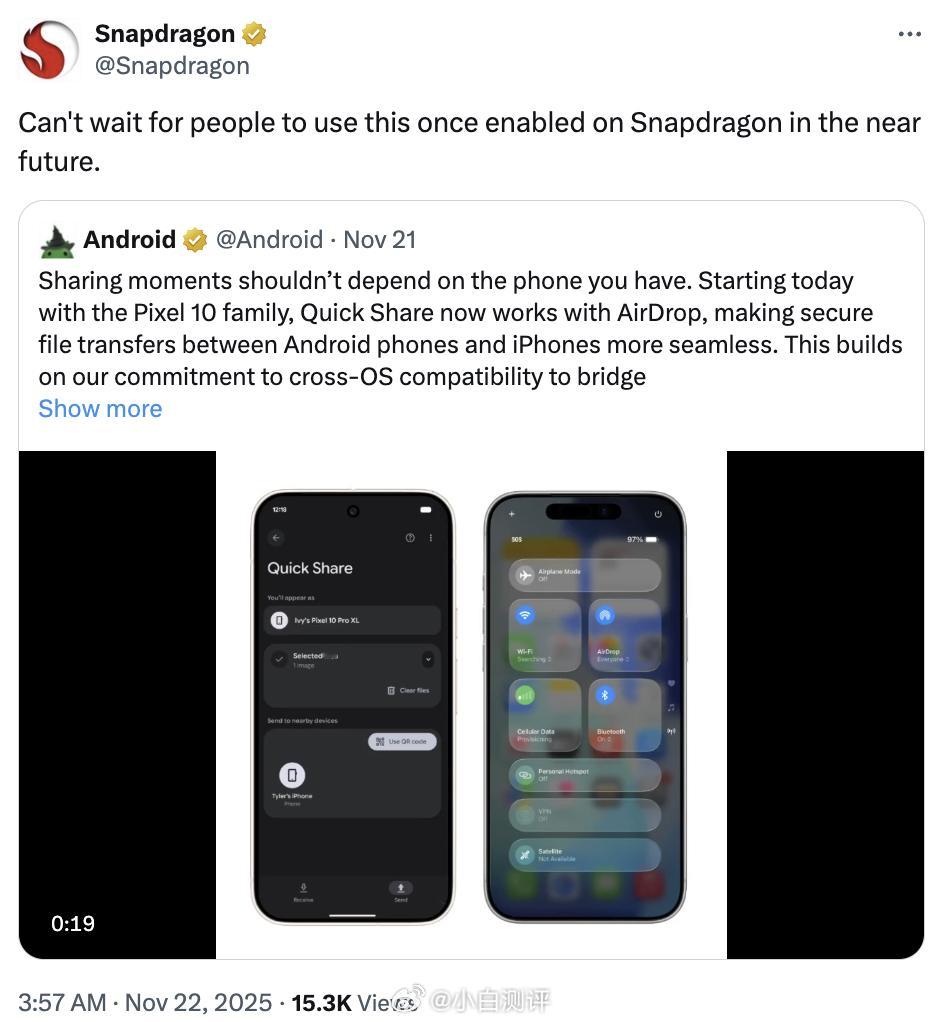 高通骁龙官方账号转发了谷歌Pixel 10系列关于打通Android和苹果隔空投送的视频,称「迫不及待地想看到不久的将来骁龙处理器支持这项功能并让人们使用」以后是不是有可能不下载App也能实现快速和iPhone互传了?🤔图2是国内厂商做的和苹果互传用的App