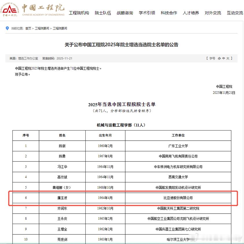 2025年11月21日,中国工程院正式揭晓新晋院士名单,比亚迪集团首席科学家、汽