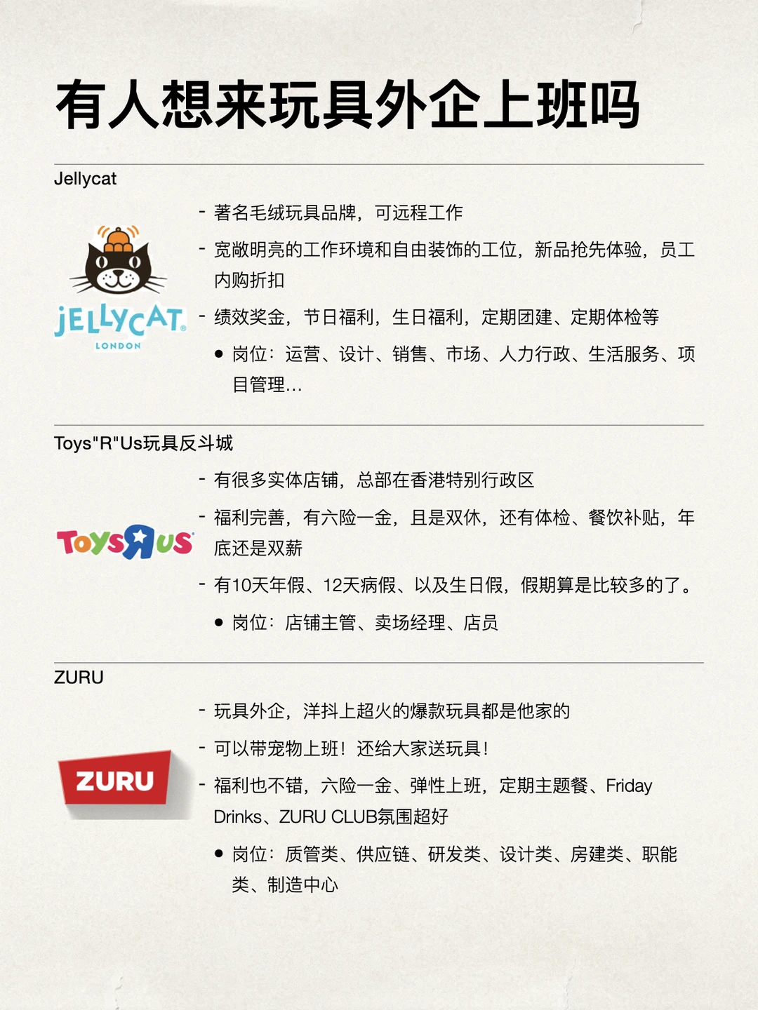 就是那种每天接触毛绒玩具、盲盒、IP周边,做市场、做设计、做授权,能第一时间接触新产品的那种 . 这两天整理了一下玩具相关的外企,像 Jellycat、ZURU、美泰、孩之宝都有在国内做业务(图里有详细的)。在招的岗位里销售偏多,但实际上设计、渠道、电商、供应链、采购、内容、品牌这些都是有需求的 . 大部分都是属于氛围好、加班少、福利还好的那种,办公环境也很治愈舒服,很适合年轻人 . 坚持日更✊🏻,对外企感兴趣的欢迎常来看看 .