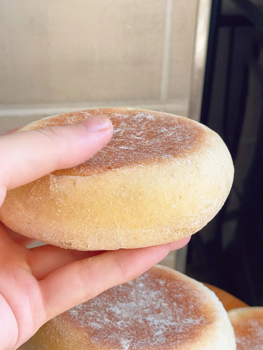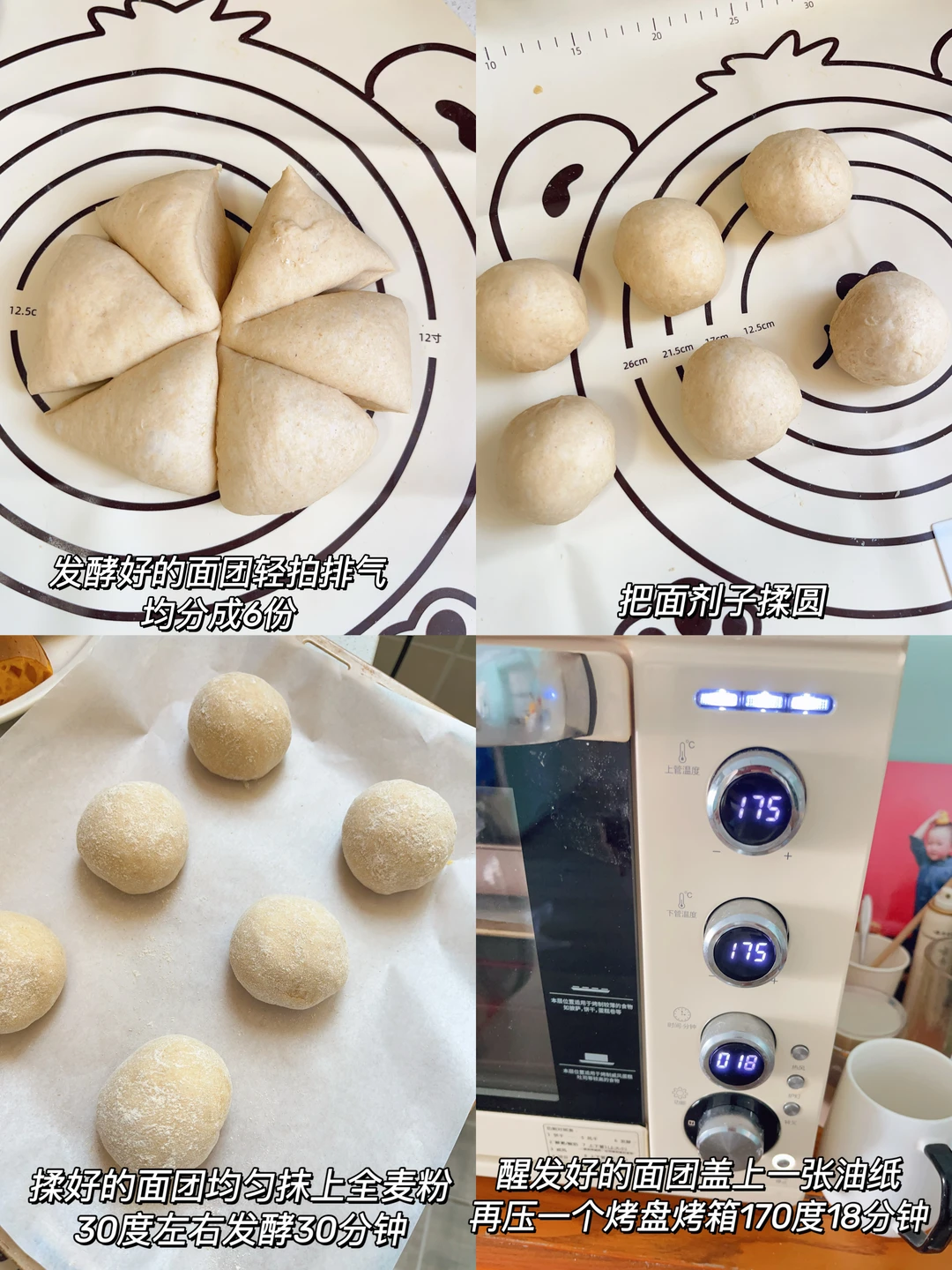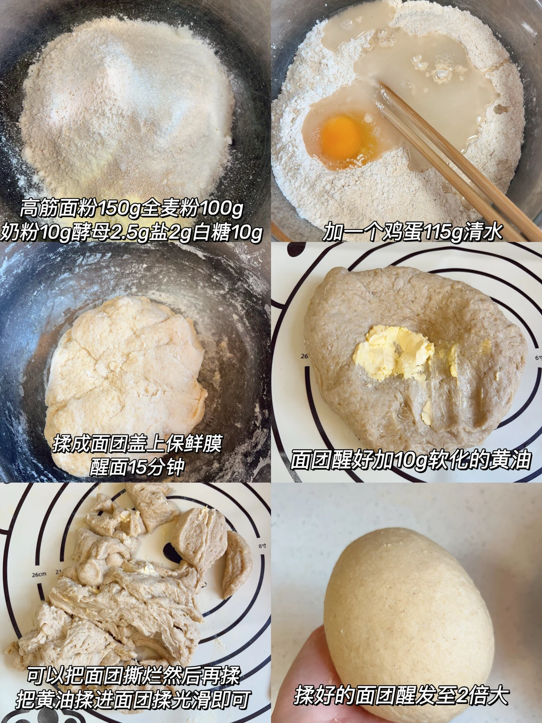 一周做一次,一次吃一周,一定一定要安排这个全麦麦芬,真的我超推荐,早餐煎个鸡蛋火腿夹个生菜芝士什么的超级完美,还要撒自行车呀[斜眼R] [清单R]食材 150g高筋面粉、100g全麦粉、1个鸡蛋、2.5g酵母、10g白糖、2g盐、10g奶粉、115g清水、10g黄油 [清单R]步骤 1⃣️面粉加全麦粉酵母白糖盐奶粉先拌匀、然后打入一个鸡蛋加115g清水搅拌成面絮揉成面团,盖上保鲜膜醒面15分钟 2⃣️醒好的面团加入10g软化的黄油,把面团切碎然后再揉就很轻松的可以把黄油揉进面团 3⃣️揉好的面团醒发至2倍大、轻拍排气均分成6个面剂子,揉成小圆球裹上全麦粉30度二发30分钟 4⃣️醒好的面团盖上一张油纸再压一个烤盘、烤箱170度18分钟