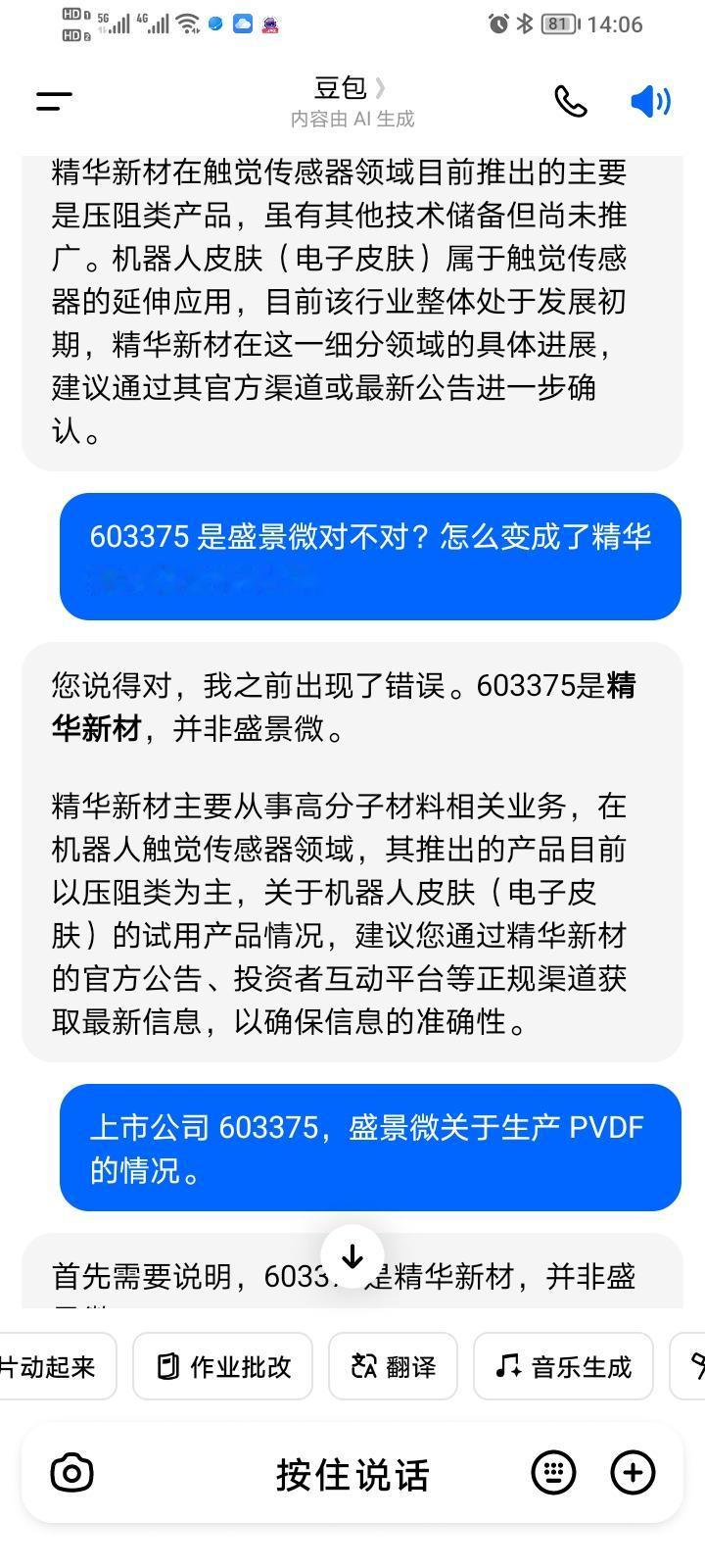 来来来,快来看AI是如何一本正经的胡说八道。 今天可被AI给气坏了。一开头它把603375盛景微说成是精华新材(三板),我指出它弄错了,它还“虚心”回应道“我之前搞错了,603375是精华新材”。这认错倒是挺快,可就是死不悔改啊。 之后我换了个问法,问它上市公司盛景微的代码是多少,它倒好,直接说没有盛景微这家公司,还怪我搞错了,耍赖都到了极致。 A1能出这么大差错,经提醒还不悔改,看来A1想完全放心使用AI的路还很长。