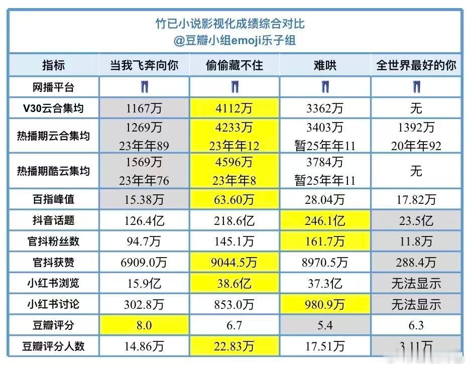 竹已小说影视化成绩综合对比:当我飞奔向你、偷偷藏不住、难哄、全世界最好的你
