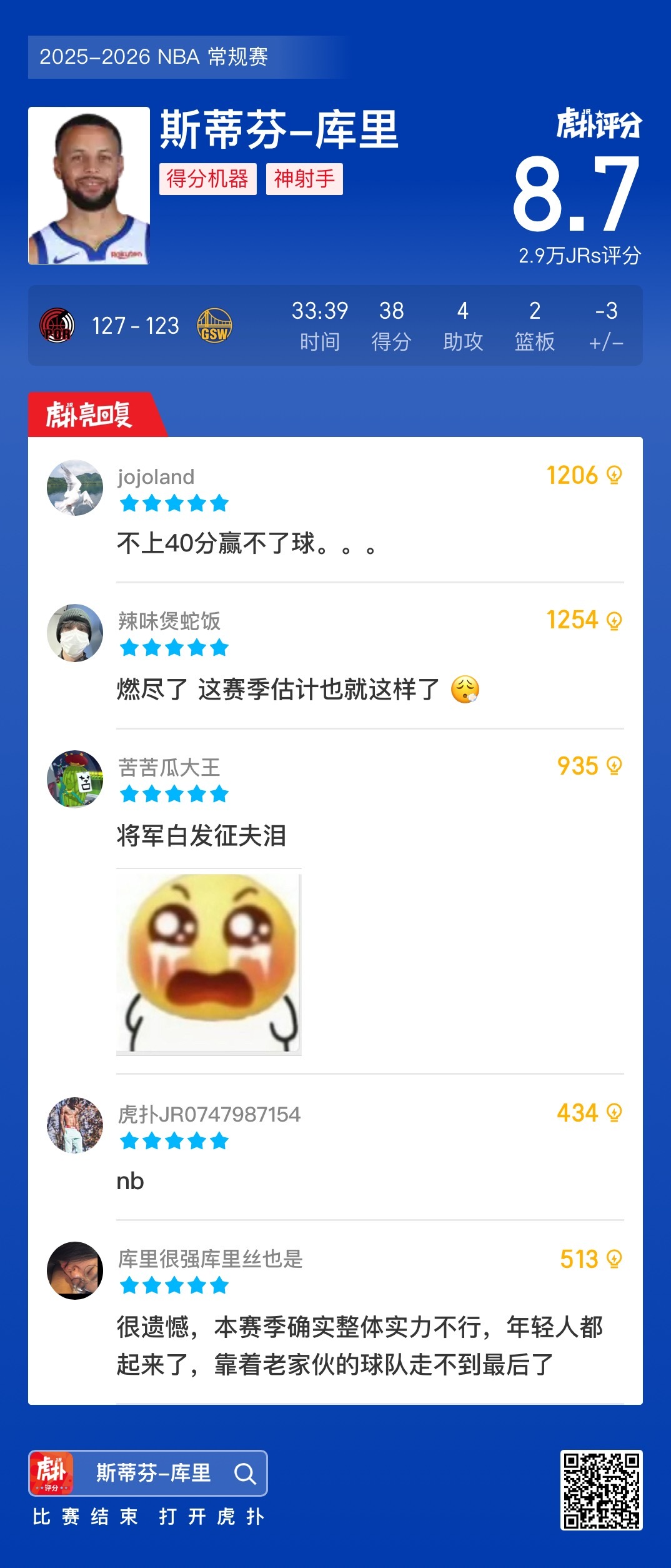 库里空砍38分,勇士不敌开拓者遭遇三连败,战绩降至9胜9负,位列西部第八NBA杯小组赛,勇士123-127不敌开拓者。此役后,勇士遭遇三连败。目前,勇士战绩来到9胜9负,位列西部第八。赛后勇士球员斯蒂芬-库里接受了记者采访,在谈到本场失利时,库里表示:“我们的表现本足以赢下比赛,却未能收获胜利。关键时刻出现了几次不合时宜的防守崩盘,让对手投进了不少空位三分。”本场比赛,勇士球员斯蒂芬-库里出战33分钟,23投14中,其中三分球17投9中,罚球1投1中,空砍38分2篮板4助攻。