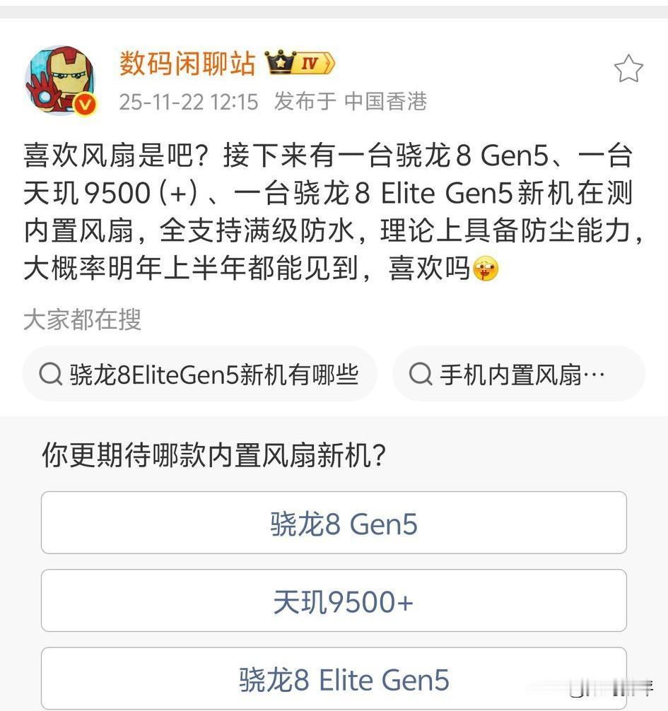 旗舰性能机开始卷内置风扇了[我想静静]因为处理器性能完全够用了,重点是如何更好释放这些性能,而不是发热就降频降屏幕亮度[思考]所以在考虑机身内置风扇,同时会支持IP69满级防水,骁龙8G5机型是OPPO下一代K系列turbo机型,还有iQOO15Ultra[灵光一闪]冲击新高端,天玑9500+机型应该是一加ACE6至尊版,明年见!