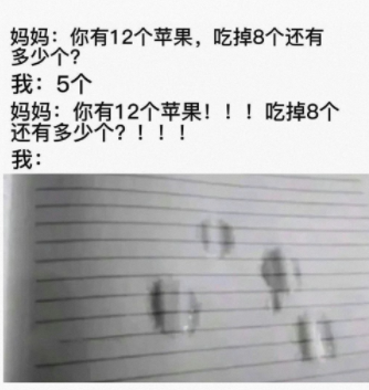 妈妈:你有12个苹果,吃掉8个还有多少个?