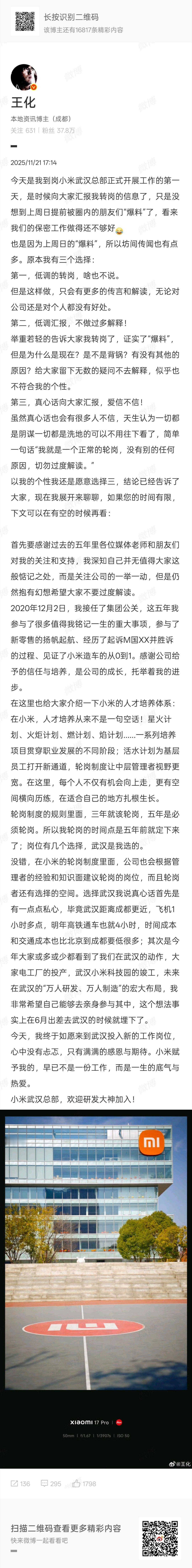 【小米集团公关部总经理王化确认转岗,前往武汉总部任职】小米集团公关部总经理王化发文,确认了网传的转岗消息,前往小米武汉总部。附全文如下:今天是我到岗小米武汉总部正式开展工作的第一天,是时候向大家汇报我转岗的信息了,只是没想到上周日提前被圈内的朋友们“爆料”了,看来我们的保密工作做得还不够好也是因为上周日的“爆料”,所以坊间传闻也有点多。原本我有三个选择:第一,低调的转岗,啥也不说。但是这样做,只会有更多的传言和解读,无论对公司还是对个人都没有好处。第二,低调汇报,不做过多解释!举重若轻的告诉大家我转岗了,证实了“爆料”,但是为什么是现在?是不是背锅?有没有其他的原因?给大家留下无数的疑问不去解释,似乎也不符合我的个性。第三,真心话向大家汇报,爱信不信!虽然真心话也会有很多人不信,天生认为一切都是阴谋一切都是洗地的可以不用往下看了,简单一句话“我就是一个正常的轮岗,没有别的任何原因,切勿过度解读。”以我的个性我还是愿意选择三,结论已经告诉了大家,现在我展开来聊聊,如果您的时间有限,下文可以在有空的时候再看:首先要感谢过去的五年里各位媒体老师和朋友们对我的关注和支持,我深知自己并无值得大家这般惦记之处,而是关注公司的一举一动,但是仍然抱有幻想希望大家不要过度解读。2020 年 12 月 2 日,我接任了集团公关,这五年我参与了很多值得我铭记一生的重大事项,参与了新零售的扬帆起航、经历了起诉 M 国 XX 并胜诉的过程、见证了小米造车的从 0 到 1。感谢公司给予的信任与培养,是公司的成长,托举着我的进步。在这里也给大家介绍一下小米的人才培养体系:在小米,人才培养从来不是一句空话!星火计划、火炬计划、燃计划、焰计划…… 一系列培养项目贯穿职业发展的不同阶段;活水计划为基层员工打开新通道,轮岗制度让中层管理者视野更宽。在这里,每个人不仅有机会向上走,更有空间横向历练,在适合自己的地方扎根生长。轮岗制度的规则里面,三年就该轮岗,五年是必须轮岗。所以我轮岗的时间点是五年前就定下来了;岗位有几个选择,武汉是我选的。没错,在小米的轮岗制度里面,公司也会根据管理者的经验和知识面建议轮岗的岗位,而且轮岗者还有选择的空间。选择武汉我说真心话首先是有一点点私心,毕竟武汉距离成都更近,飞机 1 小时多点,明年高铁通车也就 4 小时,时间成本和交通成本也比北京到成都要低很多;其次是今年大家或多或少都看到了我们在武汉的动作,大家电工厂的投产,武汉小米科技园的竣工,未来在武汉的“万人研发、万人制造”的宏大布局,我非常希望自己能够去亲身参与其中,这个想法事实上在 6 月出差去武汉的时候就埋下了。今天,我终于如愿来到武汉投入新的工作岗位,心中没有忐忑,只有满满的感恩与期待。小米赋予我的,早已不是一份工作,而是一生的底气与热爱。