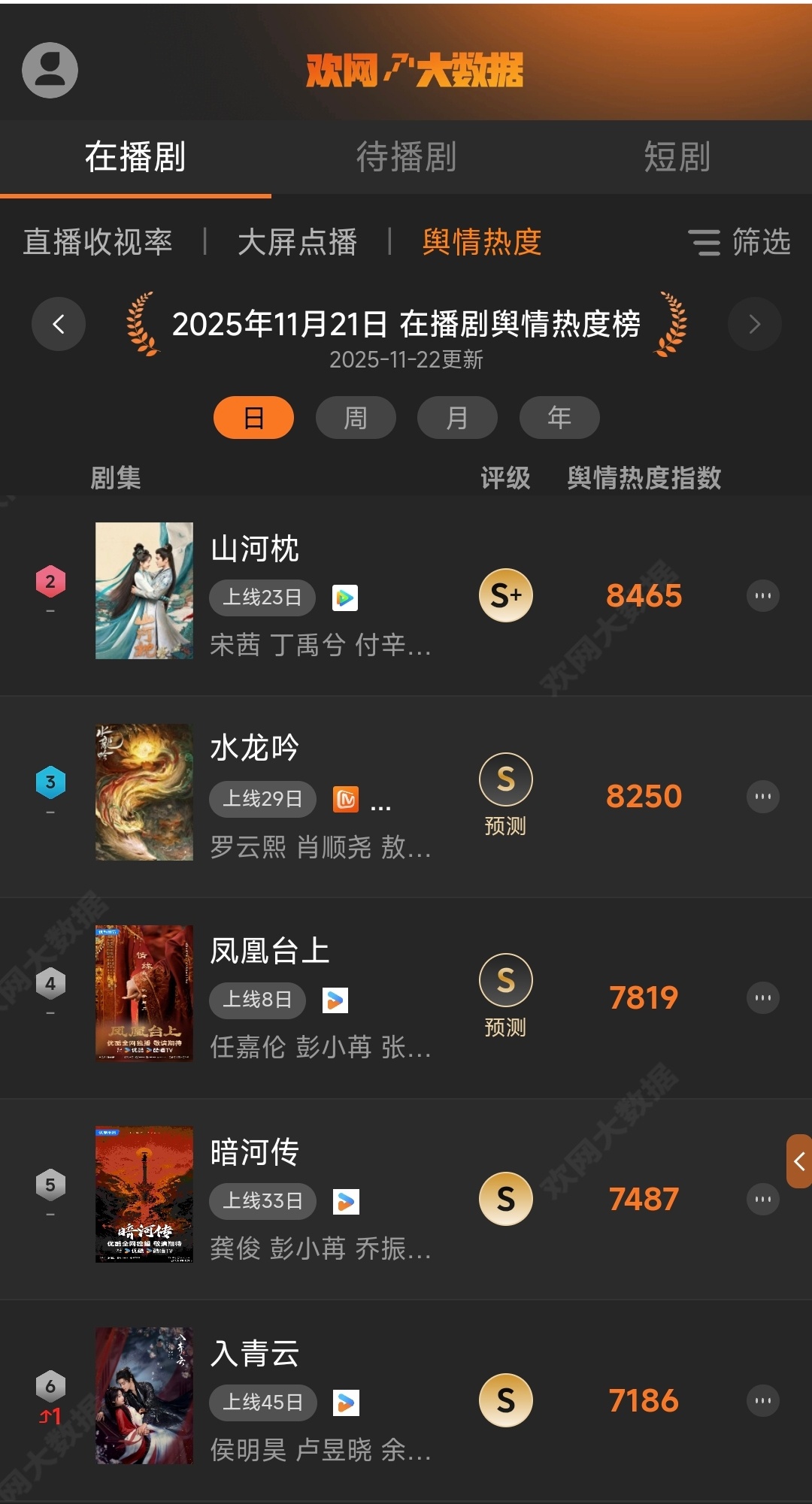 11月22日欢网大数据在播剧舆情热度榜 第二!依然是S+播出效果,网播已经完结,上星还在继续,全平台各种数据都是很亮眼的,上星剧主要看收视率,咱收视率成绩在那放着呢。氵合好的上星直接现原形。上星辐射范围更广,哪个重要一目了然。
