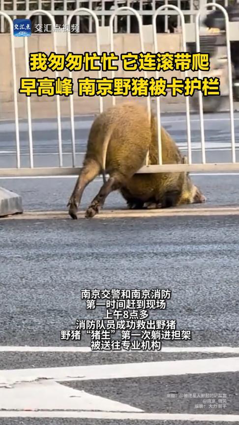 “丢人丢大了!”11月21日,江苏南京,一头170斤的野猪横穿马路,结果被卡在护栏中进退两难,野猪挣扎无果后,竟直接躺在地上“摆烂”,最终,消防和交警成功将野猪救出,并带到紫金山放生!网友:不应该送屠宰场吗? 关于是不是要继续保护野猪,现在的争论很大,有人认为野猪是生态环境中重要的一环,所以理应保护,但很多人觉得野猪会破坏庄稼,还会袭击人,给农民带来巨大的隐患,因此应该赶尽杀绝。 当天早上7点多,马路上人来人往,车流量巨大,为了防止上班迟到,大家都急匆匆的,就在这时,路中间却传来一声凄惨的猪叫声! 路人们纷纷驻足观看,原来,有一头野猪想要横穿马路,可惜高估了自己的体型,被牢牢卡在了护栏中。 由于大家都着急上班,所以都没有太长时间停留,最终有好心人报了警,交警和消防迅速赶往现场,为了防止野猪在城市里伤到市民,交警将野猪救出来后,便带到山上放生了。 城市中突然窜出来一头野猪,这搁谁看到了都会害怕,毕竟这家伙可不是好惹的,不仅皮糙肉厚的,奔跑速度还快,要是被它撞到了,真就像被炮弹砸了一样。 信息来源:《南京一野猪“打卡”南京博物院,横穿马路时被护栏卡住。野猪:不要拍了,我不要脸哒?!》江苏新闻