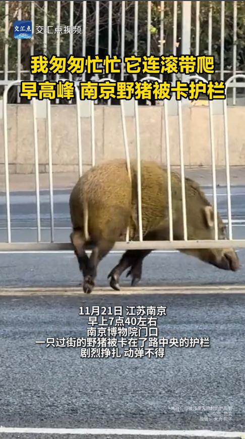“丢人丢大了!”11月21日,江苏南京,一头170斤的野猪横穿马路,结果被卡在护