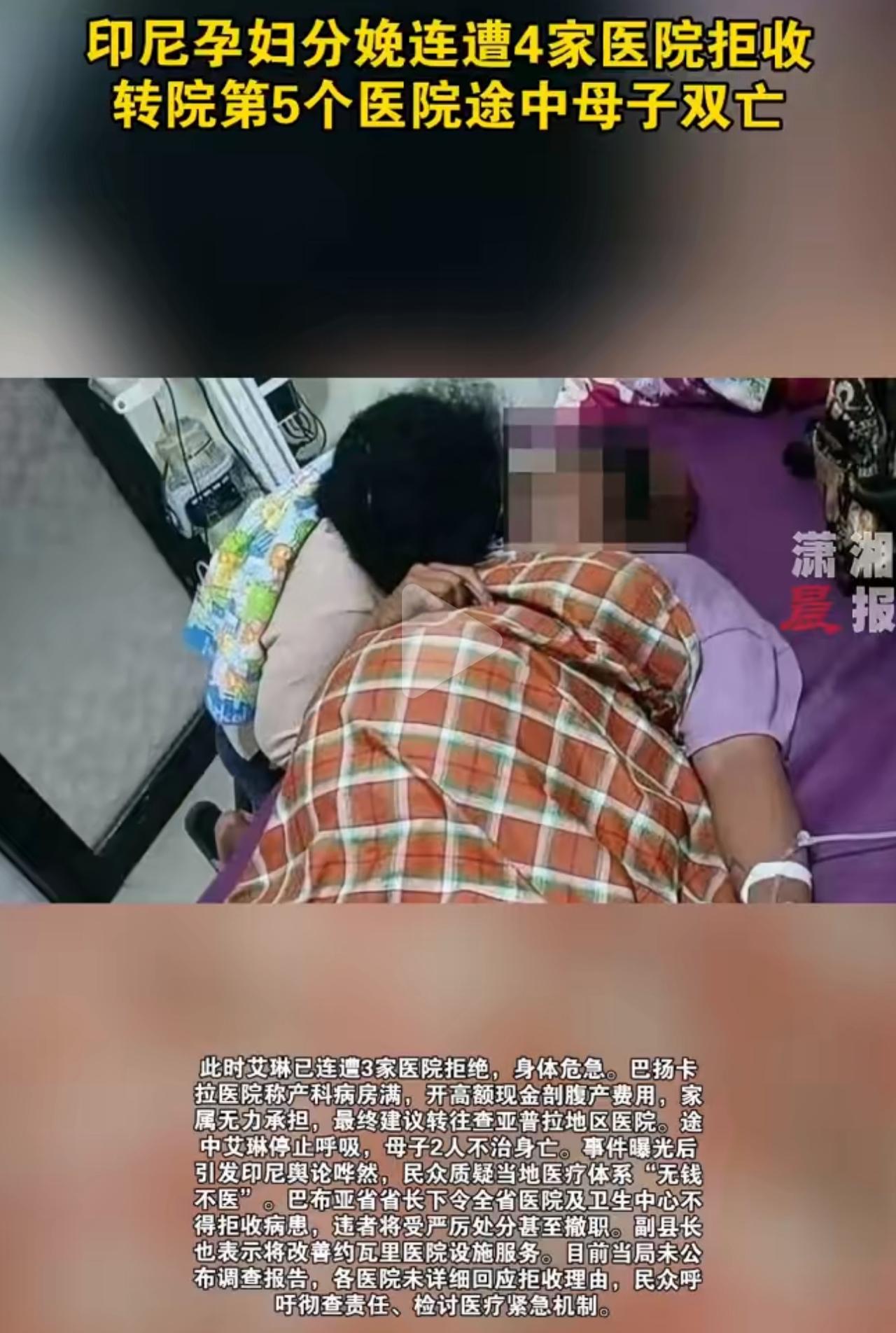 凌晨的快艇劈着浪往前冲,印尼孕妇艾琳疼得浑身发抖,双手死死按住肚子,每一次宫缩都让她忍不住闷哼,家属在旁边急得直掉眼泪,就盼着第一家医院能伸手救一把。 检查说胎儿有4公斤,必须剖腹产,可约瓦里医院瞥了一眼就摆手:“设备不行,不收。”家属抱着艾琳往第二家、第三家跑,结果人家连门都没让进,直接挥手打发,艾琳的脸白得像纸,眼神里的盼头一点点变成绝望。 第四家警察医院总算肯接了,却冷冰冰扔出一句:“先交800万印尼盾现金(差不多3700块,够当地人挣俩月)。”家属翻遍全身也凑不齐,跪着求情,换来的还是“没床”的硬邦邦回应。 往第五家医院赶的路上,艾琳的呼吸越来越轻,双手紧紧攥着家属的衣角,最后头一歪,再也没醒过来,肚子里的孩子也没能见着太阳。 两条人命啊,就这么毁在医院的互相推诿和钱眼里!医疗本是救人的行当,啥时候变成了没现金就不救命的冷漠买卖? 省长说“拒收就撤职”看着解气,但没真金白银投设备、没实打实的追责,下次说不定还会有下一个艾琳。只愿这对母子的离去,能真的敲醒那些麻木的人,别再让生命被随意辜负!印尼孕妇分娩遭4医院拒收母子双亡 孕妇