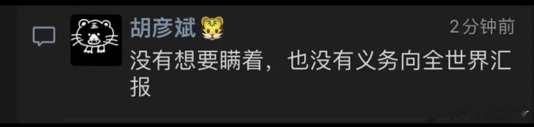 胡彦斌空降粉丝群说:“没有想要瞒着,也没有义务向全世界汇报”。老胡虽然没有义务,却真的向全世界汇报过了。