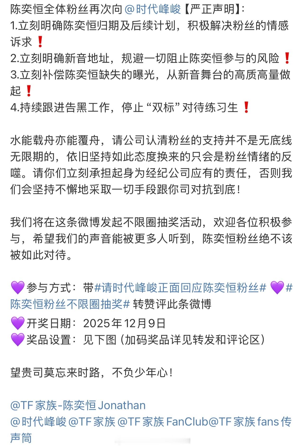 陈奕恒粉丝发起不限⭕抽/奖希望公司尽快回复粉丝诉求,停止双标行为