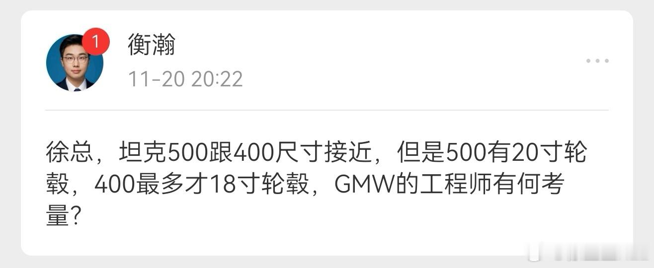 这个问题,按我的理解。400的定位更偏向越野一些,越野不适合大轮圈,因为扁平比低,所以400给配的17、18寸的。而500的定位更偏向商务一些,大轮圈帅,所以就给500选装20寸轮圈了。越野领域,很多东西跟普通家用车都是反着来的。越野领域要的是整体桥,小轮圈,较少的电气化。而普通家用车追求双叉臂、空悬、大轮圈、低风阻,更多的电气化。