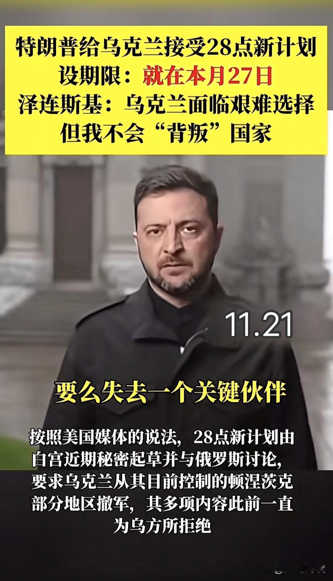 当地时间11月21日,乌克兰总统正式对国际社会表示,并回应了他对于美国版28点旨在结束俄乌冲突新计划的看法。 当地时间11月21日乌克兰总统的表态,说白了就是把心里的苦水倒了出来——作为一个夹在两个军事大国之间的地区小国,如今算是被逼到了墙角,一边是曾经喊着“支持到底”的美国,一边是直接兵戎相见的俄罗斯,俩大佬都逼着它签和平协定,这协定里的条款要是细究起来,说是丧权辱国一点都不过分。这种处境搁谁身上都得崩溃,毕竟历史上也没几个小国能同时被两个顶级军事强国联手“拿捏”。 要是往前倒腾几年,乌克兰还真没料到美国会翻脸这么快。早年间美国为了在东欧牵制俄罗斯,对乌克兰那叫一个“大方”,又是给军事援助又是给政治背书,光是2014年到2020年期间,美国给乌克兰的各类援助加起来就超过了300亿美元,其中军事援助占了近三分之一,小到步枪子弹大到反坦克导弹,基本上是乌克兰前线需要啥就给啥。 那时候乌克兰在东部战场虽然打得艰难,但靠着美国和北约的支援,好歹能跟俄罗斯支持的武装力量掰掰手腕,甚至在2019年还趁着俄罗斯战略调整的间隙,收复了赫尔松附近的几个关键据点,当时不少人都觉得再坚持一阵子,说不定能把战线往东部推得更远。 可这一切都随着特朗普的上任变了味,乌克兰这大半年的日子简直是从云端跌到了泥里。特朗普打从竞选时就对给乌克兰援助这事不情不愿,觉得“美国没必要为了一个欧洲小国花那么多钱”,上任之后更是把这种想法落到了实处。 最典型的就是2024年上半年那档子事,美国原本承诺给乌克兰的120亿美元军事援助,硬是被特朗普政府压着不发,理由是“要先审核乌克兰的援助使用情况”,可明眼人都知道,这就是拿援助当筹码逼乌克兰办事。 当时乌克兰前线正缺反坦克导弹和防空系统,俄罗斯刚好趁着这个空当发起了春季攻势,乌克兰因为弹药跟不上,丢了扎波罗热附近的三个重要村镇,光士兵伤亡就比前一个月多了40%,之前好不容易攒下的优势就这么打了水漂。 更让乌克兰憋屈的是,特朗普不光卡援助,还逼着它跟俄罗斯“谈条件”。有知情人士透露,美国提出的28点计划里,光让乌克兰让步的条款就占了15条,比如要求乌克兰承认克里米亚归俄罗斯所有,还要把东部顿巴斯地区设为“高度自治区域”,这跟直接割地没啥区别。 为了让乌克兰就范,特朗普政府还玩起了“软硬兼施”的套路,一边说“不签就彻底断援”,一边又承诺“签了之后美国会帮乌克兰加入世贸组织”。 这种威逼利诱的手段,把乌克兰架在了火上烤——不签的话,前线没弹药撑不了多久;签了的话,不光丢了领土,国内民众也不会答应,总统的位置都坐不稳。 这边美国步步紧逼,那边俄罗斯也没闲着,早就摆出了“不签就接着打”的架势。俄罗斯陆军在乌克兰东部部署了超过30万兵力,还调来了1000多辆坦克和2000多门火炮,光是2024年10月一个月,就对乌克兰的军工企业和交通枢纽发动了12次大规模空袭,导致乌克兰的炮弹产量直接下降了60%。 可能有人会问,美国之前不是乌克兰的“铁杆盟友”吗?怎么说变脸就变脸?其实说白了,美国从来没把乌克兰当成真正的盟友,只是把它当成了牵制俄罗斯的棋子。特朗普上台后,更看重的是美国的“实际利益”,觉得与其在乌克兰跟俄罗斯耗着,不如跟俄罗斯做交易,比如用乌克兰的领土换俄罗斯在能源和贸易上的让步。这种算盘打得噼啪响,可苦了乌克兰这个“棋子”。 乌克兰现在的困境,其实就是地区小国在大国博弈中的缩影。之前靠着美国的援助,还能勉强维持跟俄罗斯的平衡,可一旦美国撤梯子,俄罗斯的压力就压得它喘不过气。 有数据显示,2024年乌克兰的GDP下降了22%,超过600万难民流离失所,军工企业被摧毁了70%以上,就算想硬抗也没那个实力了。 而美国和俄罗斯之所以敢同时施压,就是吃准了乌克兰没别的靠山——欧盟虽然嘴上喊着支持,可实际给的援助还不到美国之前的一半,而且还怕得罪俄罗斯断了能源供应;其他国家要么实力不够,要么不想卷入大国冲突,根本帮不上啥忙。 特朗普政府的无序操作,更是把乌克兰的处境推向了绝境。之前美国给乌克兰援助时,还会协调北约国家一起出钱出力,可特朗普上台后,一味地搞“美国优先”,跟北约盟友闹得很僵,导致2024年北约给乌克兰的援助减少了50%。 更要命的是,他还动不动就放话“要从欧洲撤军”,让北约国家也不敢再大力支援乌克兰,生怕美国真的撒手不管,自己成了俄罗斯的“下一个目标”。 就这样,乌克兰从之前的“有靠山”变成了“没人管”,只能在美俄的双重压力下任人摆布,所谓的“丧权辱国协定”,搞不好真的要被迫签字了。