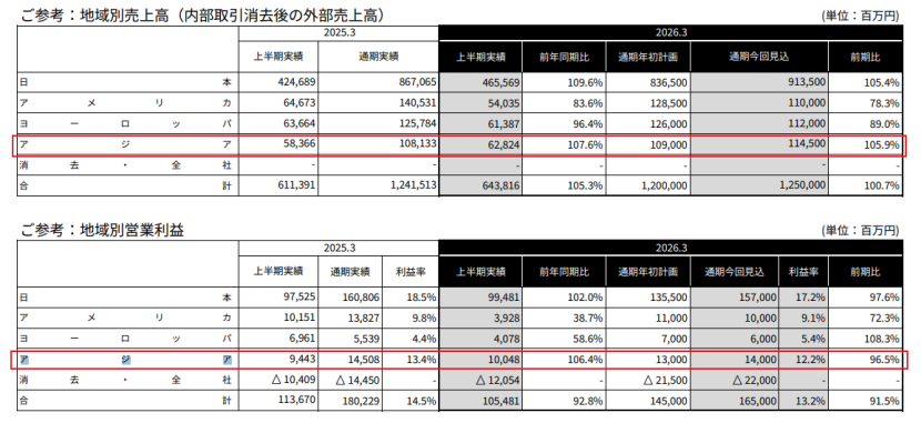 分地区来看,万代南梦宫将其主要市场分为日本、美国、欧洲及亚洲四大区域。财报显示,2025年4-9月,亚洲区贡献了6282.4亿日元的销售额,同比增长7.6%;营业利润高达1004.8亿日元,同比增长6.4%。