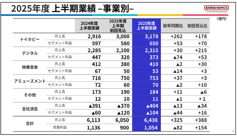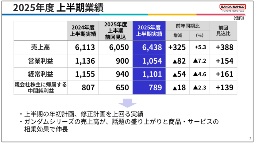 近日,万代南梦宫发布了2025年度上半期业绩(实际时间为2025年4月至9月),雷报据此获悉: