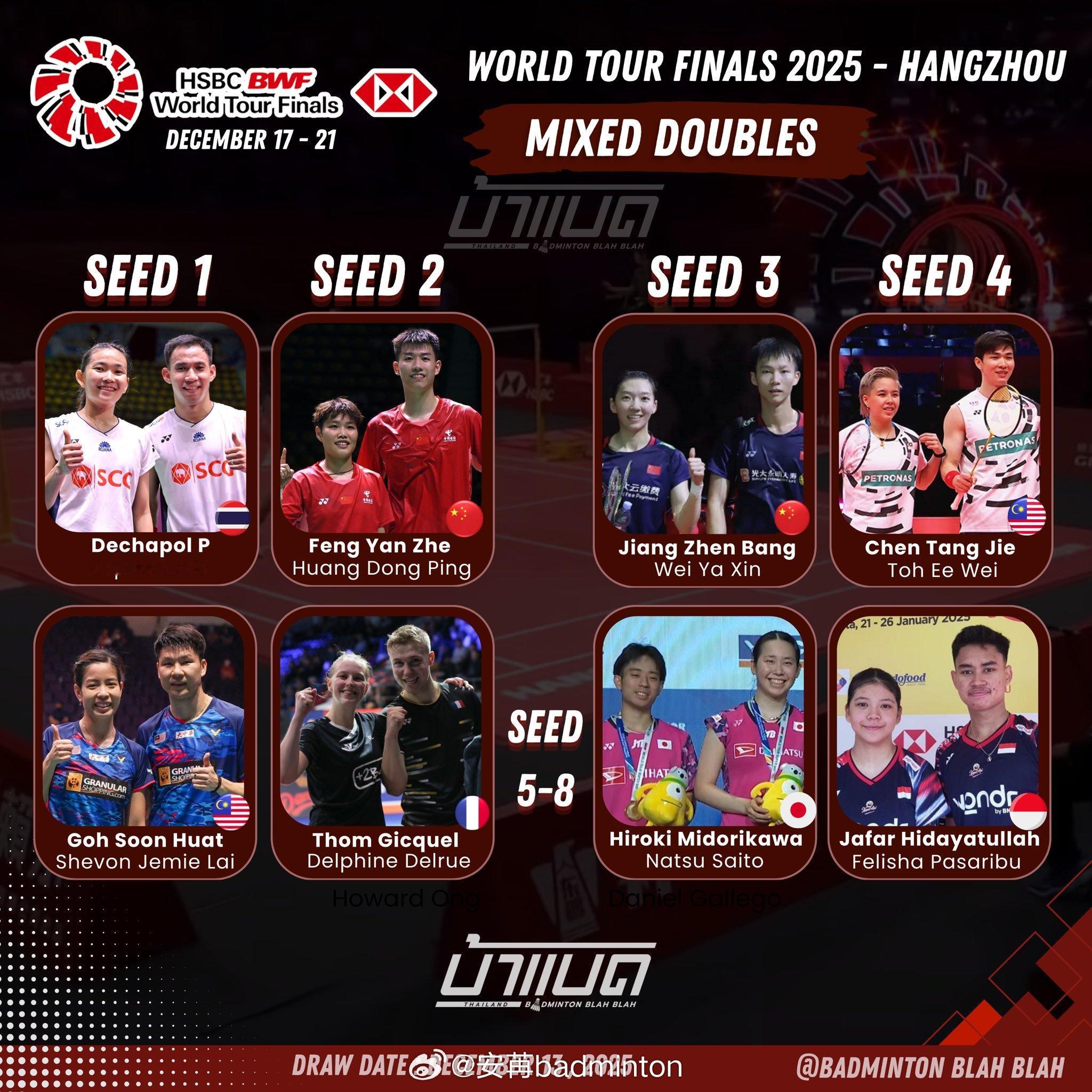 混双八席全部出炉1.德差波/苏皮萨拉🇹🇭(1号种子)2.冯彦哲/黄东萍🇨🇳(2号种子)3.蒋振邦/魏雅欣🇨🇳(3号种子)4.陈堂杰/杜颐沩🇲🇾(4号种子)5.吴埙阀/赖洁敏🇲🇾6.吉凯尔/德尔吕🇫🇷7.绿川大辉/斋藤夏🇯🇵8.希达亚图拉/费利沙🇮🇩