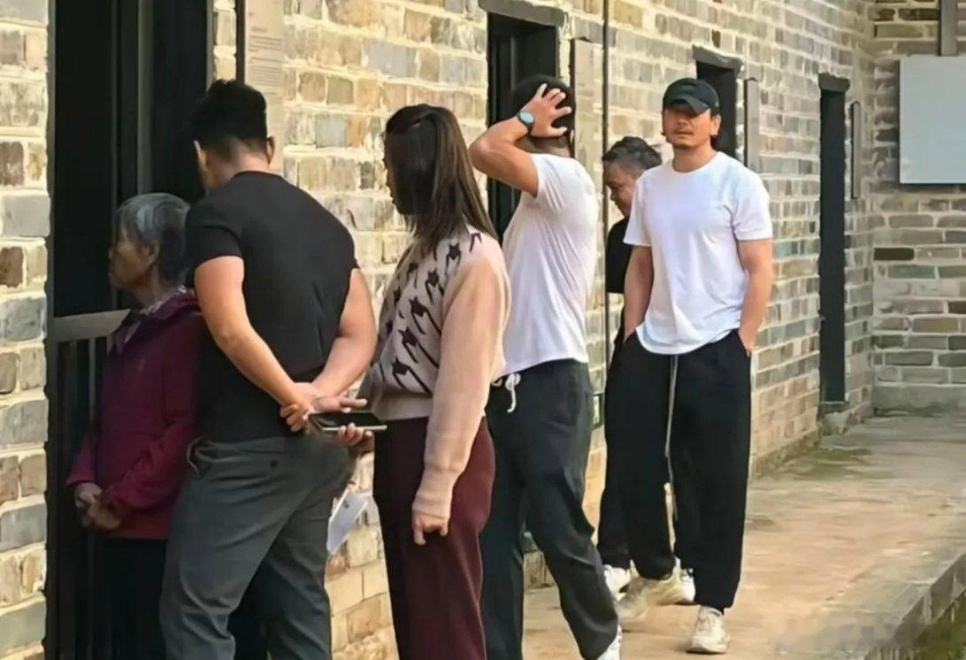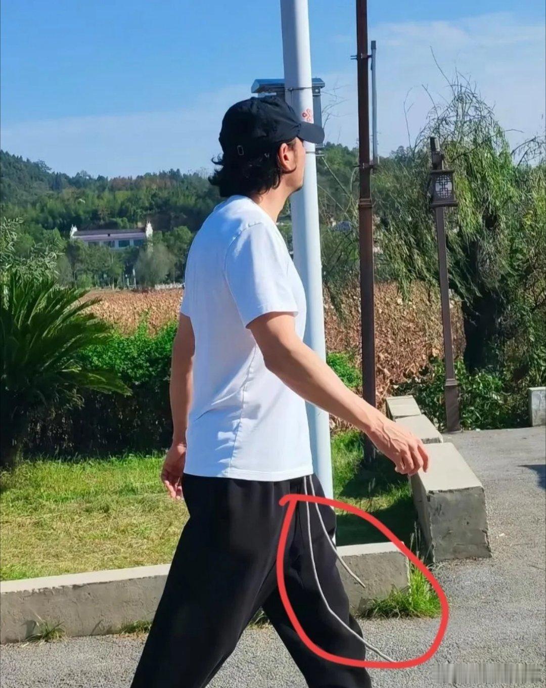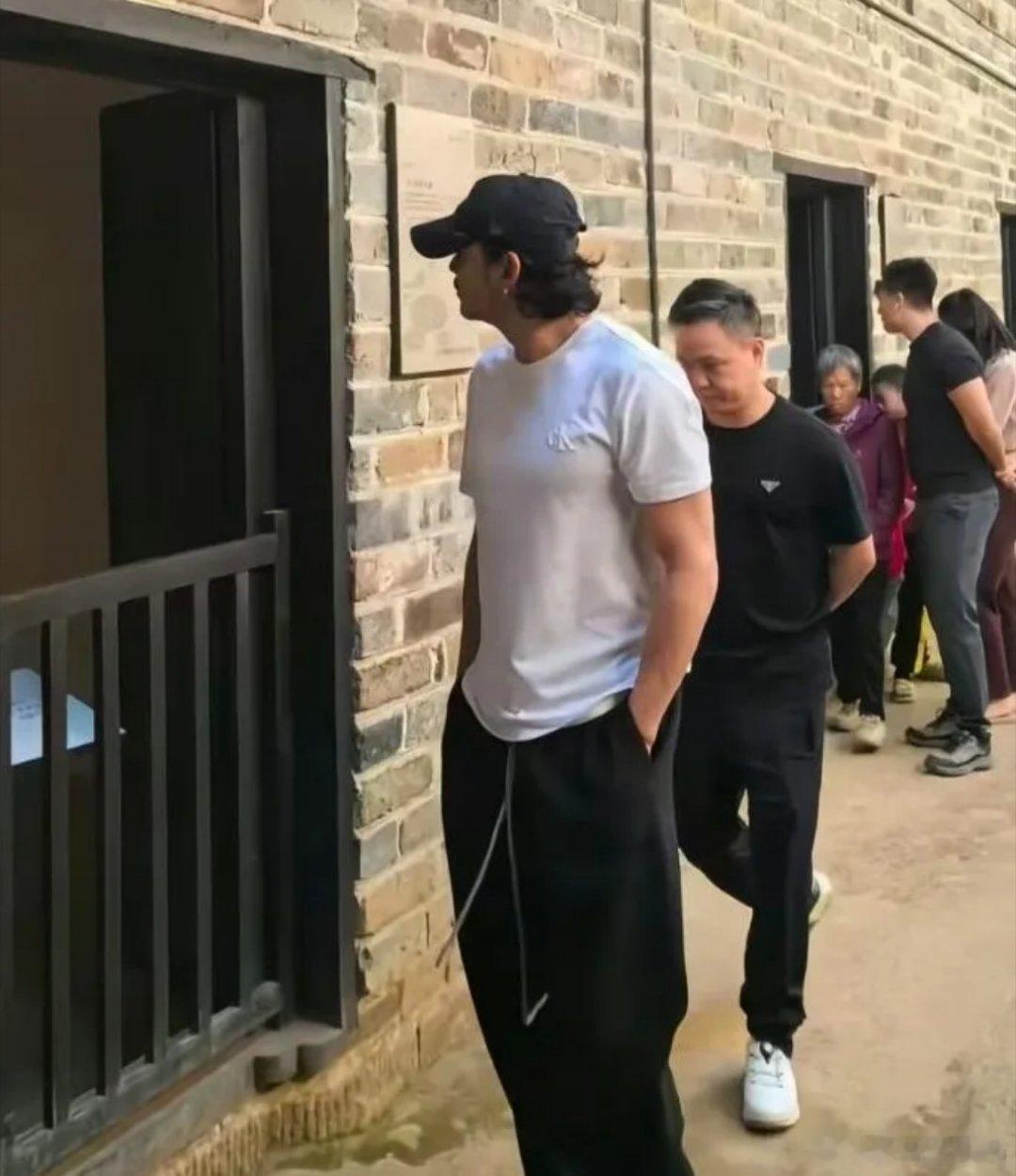 型男杨烁在湖南乡村游玩,头发卷曲,胡子拉碴,身穿白色圆领T恤衫黑色运动裤,裤腰上的系绳在裤子前飘扬!!!