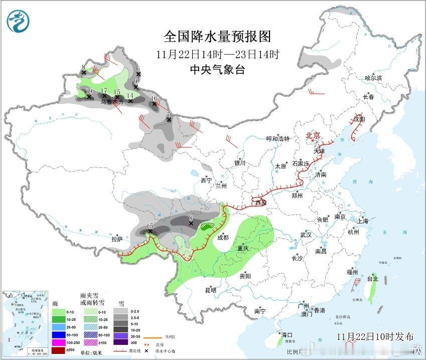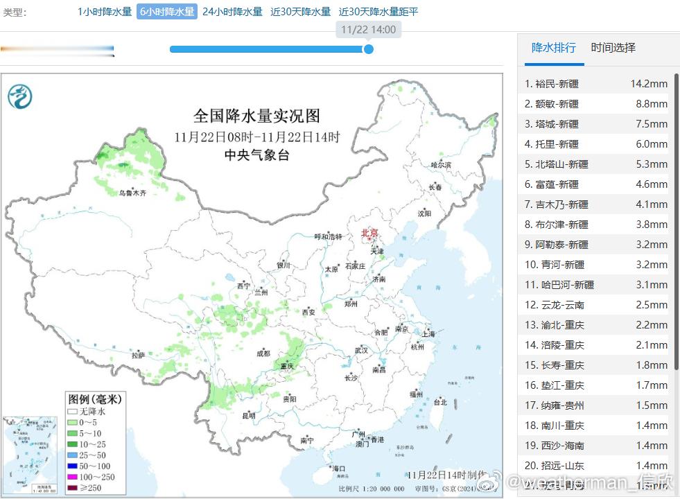 【降水和干燥】今天白天,我国大部地区依然干燥。下午石家庄相对湿度不到10%,郑州只有12%。即便是南方城市,也不少低于40%,上海、福建龙岩、广西北海不到30%,深圳38%。今天08-14时,降水主要在西南地区以及新疆北部。新疆站点包揽了6小时降水榜前10。今天下午到明天中午,新疆天山沿线、西藏东北部、四川西北部还有明显降雪。