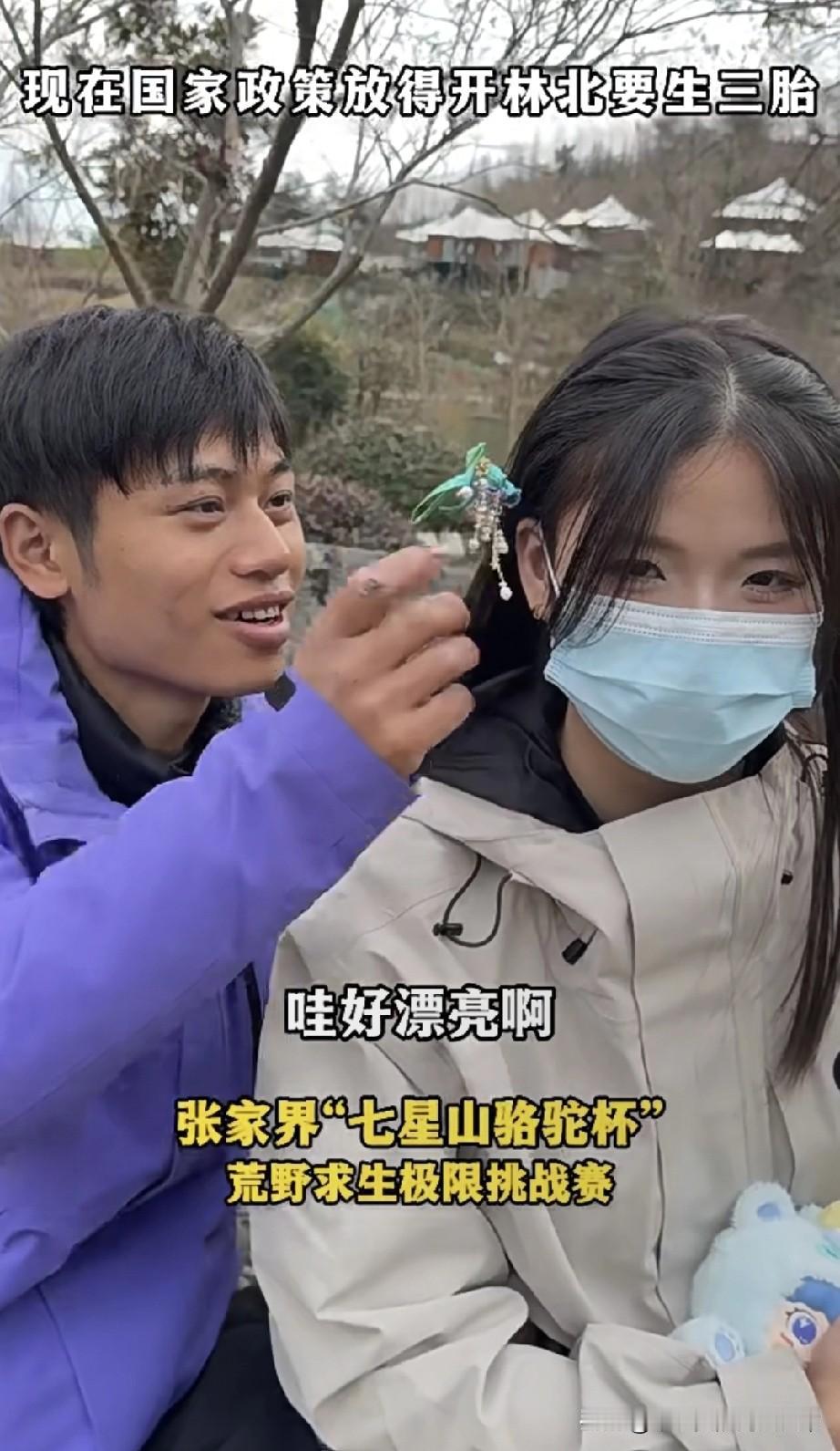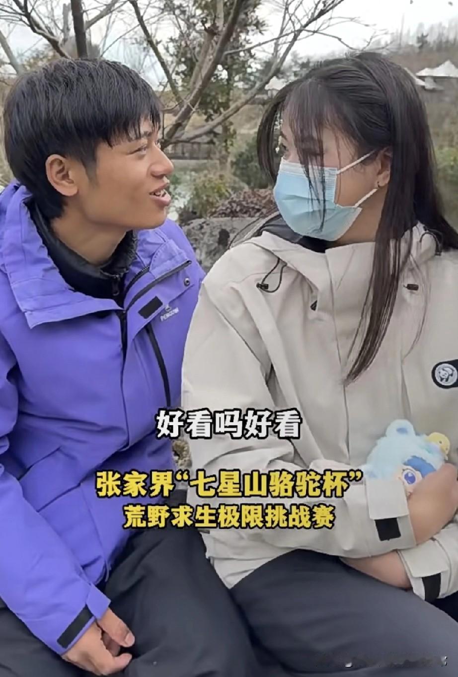 离大谱!荒野求生赛变恋爱生娃现场! 张家界这场“七星山骆驼杯”求生赛,直接给我看懵了—— 说好的钻木取火、野外生存,结果一哥们儿蹲在林间步道上,对着女伴连夸“好看”,还扯着嗓子喊“现在政策放得开,林北要生三胎”。 镜头里两人挤在长椅上,手里还攥着毛绒玩具,哪有半分求生的样子?弹幕全炸了:“这是来比赛还是度蜜月?”“流量密码算是让你玩明白了”。 咱就说,求生赛搞成恋爱综艺,到底是“节目效果”还是糊弄观众? 你觉得:这种“跑偏”的比赛,是该乐呵乐呵,还是该严肃对待规则?