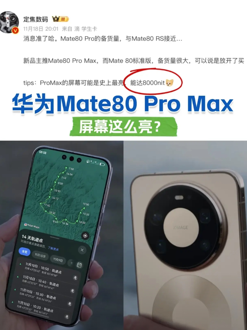Mate80Pro Max屏幕亮度据说达到恐怖的8000尼特! 这就是双层OLED的优势吧 除了名字,以及没有了我个人比较喜欢的微曲屏(类似Mate60Pro),其他方面,已经趋近完美了 看看上市会是什么价格吧。