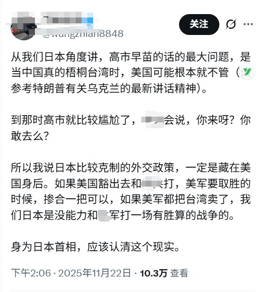 大侄子自认日本人,日本认你了? 话虽不糙,可车力巨人有哪个不跟删了民智一样,还讲道理,明显是无法融入啊! 留言处看到一暴论,不妥,改了一下:岛内有4成人跟日本是真爱,不如统一之前,把他们迁到日本;有4成人跟美国是真爱,这部分人有钱的买金卡登陆美国本土,没钱的送关岛夏威或是波多黎各;剩下了成为我中华人民共和国公民。先派我军稳定内部,再效仿历史中原戍边。日本收获一大批饿死都不反的忠诚国民和廉价劳动力,极右翼的铁票仓;美国财名双收,不仅得财,还博得离岛接受精神美人的善名。老中获得土地。不是一举三得啊! source: X
