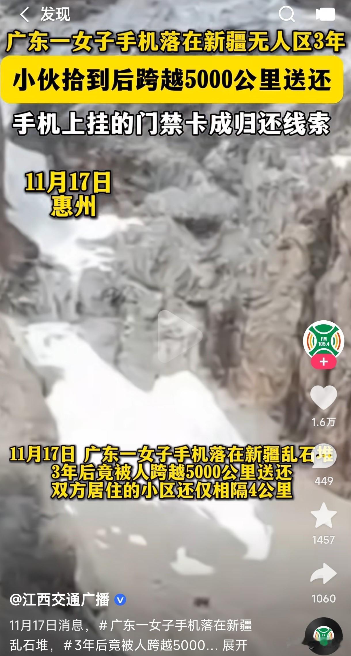 广东一女子手机落在新疆无人区乱石堆,3年后竟被小伙捡到后跨越5000公里送还,双方居住的小区仅仅相隔 4公里。 这样的一幕简直是太不可思议了,3年后还能在无人区捡到丢失的手机,这到底是巧合遇到还是天意?然而手机上挂的门禁卡成为归还手机的重要线索,先不说这个手机能用不能用是一回事,这小伙的举动简直太暖心了,他捡到手机后凭着门禁卡上面的信息竟然找到了失主,而且之前居住的小区仅仅相差4公里,这到底是缘分呢还是天意呢? 落在无人区3年的手机不知还能用吗?