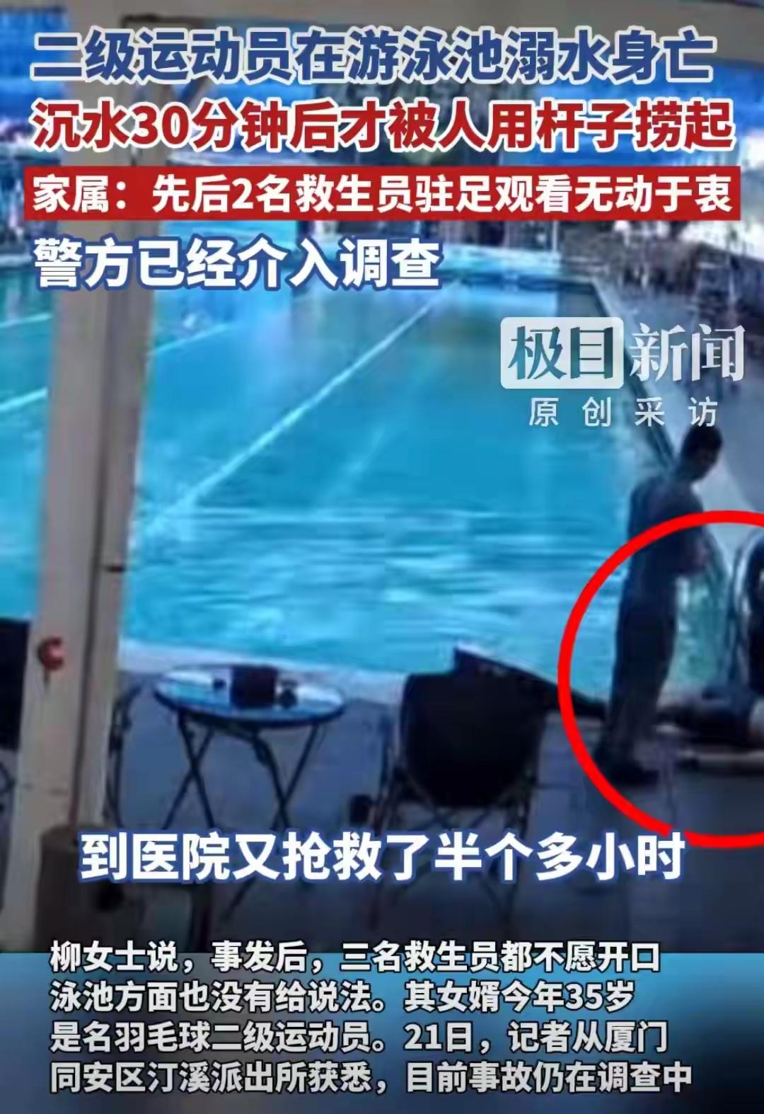 11月17日上午9点,一名男子到厦门温泉度假村室内游泳池游泳。池里只有二、三人,池边也有二、三个救生员。男子是国家二级羽毛球运动员,喜欢游泳。他穿着脚蹼尽情的在池子里游。池边的救生员时时刻刻的注视池水里的情况。 男子忽然在水里不动了,沉在水里。一名救生员站在男子上方,低着头看男子,没采取任何行动。5分钟后,另一名救生员过来,观察一下又走了。直到第三名救生员才发现情况不对,用竹竿把男子捞上来。此时,男子沉在水里已经近30分钟,送到医院回天乏术,给出的诊断是溺水身亡。 泡温泉是很舒服,但是泡的时间久了会产生不适。我有个同事去泡温泉,被发现不能动了。同事们七手八脚把他弄上岸,休息了好长时间才恢复正常。 男子沉入水里这么长时间,真弄不明白,救生员为什么不采取措施。目前警方已介入调查。希望查明原因,杜绝此类事件发生。 羽毛球运动员在度假村游泳池溺亡泡温泉 溺亡 晒图笔记大赛