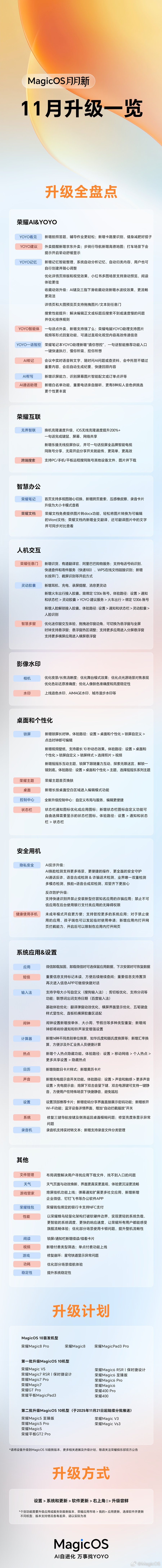 【荣耀 MagicOS 公布 11 月升级一览:一句话点外卖新增支持饿了么,火车出行接入灵动胶囊等】荣耀MagicOS公布 11 月升级一览,支持 AI 帮记帮写帮看,AI 帮接电话还能切换音色,无界智联投屏与分享一句话搞定,零重力通透设计支持长时钟锁屏、视频锁屏。整理如下:YOYO 看见新增拍照答题,辅导作业更轻松新增卡路里识别,健身减肥好搭子YOYO 建议外卖提醒新增京东外卖步骑行导航新增高德地图打车场景下会提示开启晕动舒缓显示YOYO 记忆新增记忆智能整理,系统自动分析记忆,自动归类内容,用户也可自行创建并随心调整优化详情页排版和视觉效果,小红书多图场景支持滑动预览,阅读体验更佳收藏动效升级:AI 键及三指下滑收藏动效新增水波纹效果,更流畅更简洁详情页和大图预览页支持拖拽图片 / 文本到任意门搜索性能提升:解决编辑正文或标题后搜索不到或速度慢的问题并优化排序规则YOYO 智能体一句话点外卖,新增支持饿了么荣耀电脑 YOYO 助理支持图片视频等形式回复功能,可通过直观化视觉内容高效传递信息YOYO 一语智控荣耀笔记本 YOYO 助理新增“猜你想控”,一句话智能推荐功能入口一键快速执行AI 帮记会议中实时语音转文字,随时问 AI 问题或查资料,会中托管不错过重要内容,会后自动生成纪要,快捷回顾内容AI 帮写新增识屏能力,识别屏幕图片智能配文或订单点评等AI 通话助理新增白名单功能,重要电话亲自接听,更有 8 种拟人音色供挑选更个性更丰富无界智联换机克隆速度升级,iOS 无线克隆速度提升 200%+ 一句话完成键鼠、屏幕、网络共享新增乐播无线投屏协议,并可一句话投屏全品牌智能电视同账号分享,无需开启分享开关就能传,更简单,更高效跨端搜索支持 PC / 手机 / 平板远程搜同账号其他设备文件、图片并下载荣耀笔记首页支持多视图随心切换,新增跨页套索、压感橡皮擦,录音卡片升级为大小卡模式查看荣耀文档荣耀文档免费提供图片转 docx 功能,轻松将图片转换为可编辑的 Word 文档荣耀文档内新增全文翻译,还可翻译图片中的文字并可同步对比查看荣耀任意门新增识货、有道翻译官、阿里巴巴购物服务支持电话号码识别、快递查件和寄件服务 (快递 100)、WPS 在线文档链接识别新增长按开门、截屏识别等开启方式灵动胶囊新增耳机、充电、录屏提醒,消息更灵动新增火车出行接入胶囊,需绑定 12306 账号。体验路径:设置 > 通知和状态栏 > 灵动胶囊 > YOYO 建议服务 > 火车出行 > 绑定 12306 账号新增人脸解锁接入胶囊。体验路径:设置 > 通知和状态栏 > 灵动胶囊 > 人脸识别智慧多窗优化迷你窗交互体验,拖拽迷你窗边角,可切换为悬浮窗与全屏时钟支持悬浮窗悬浮窗热区调整支持更多应用进入分屏悬浮窗支持更多横屏应用进入横屏悬浮窗相机优化夜景 / 长焦清晰度优化舞台模式效果优化点光源场景对焦表现优化色彩还原准确度优化人像肤色准确度和亮度稳定性水印上线追色水印、AiMAGE 水印、城市漫步水印等锁屏新增锁屏长时钟。体验路径:设置 > 桌面和个性化 > 锁屏自定义 > 点击时钟即可编辑新增视频壁纸,支持最长 10 秒动态效果。体验路径:设置 > 桌面和个性化 > 锁屏自定义 > 锁屏样式 > 选择照片 > 视频新增摇摇乐互动主题,锁屏下跟随重力互动,探索无限迷宫,解锁一镜到底。体验路径:设置 > 桌面和个性化 > 主题,选择摇摇乐系列主题荣耀主题荣耀主题首页焕肤桌面新增长按桌面空白区域进入编辑模式功能控制中心全新升级控制中心:自定义布局与服务,编辑更便捷状态栏状态栏通知图标优化成应用图标新增状态栏图标自定义功能可自由选择需要显示的状态栏图标。体验路径:设置 > 通知和状态栏 > 状态栏隐私安全AI 反诈升级:AI 换脸检测支持更多场景,更便捷的操作,更全面的安全守护 AI 通话反诈,语音合成检测 & 诈骗话术检测,业界唯一双重检测多模态检测,换脸 + 语音合成双检测,双管齐下更放心反诈防护升级:支持快速识别并禁止安装新型仿冒知名应用的诈骗应用; 禁止不可信应用在后台使用银行支付类应用的无障碍权限健康使用手机未成年模式开启更方便支持管控更多的系统应用对于禁止使用的应用,孩子端也可以发起临时使用申请新增应用内打开网页拦截能力,开启后可以限制在应用内打开网页应用微信卸载加固,卸载微信时可选保留应用数据,下次安装时可恢复数据短信重要信息支持标记未读,方便后续继续查阅重要信息支持置顶再次进入信息 App 可继续快捷对话输入法支持字母大小写自定义 (搜狗输入法)剪切板优化,支持分词等功能联想词出词支持日期 (百度输入法)基础体验优化:翻译弹窗动效优化,横屏界面显示优化,五笔键盘样式显性化,直板机横屏胶囊区适配闹钟闹钟设置新增按单休、大小周、节假日等多种类型重复新增闹钟即将响铃通知和铃声渐变增强设置