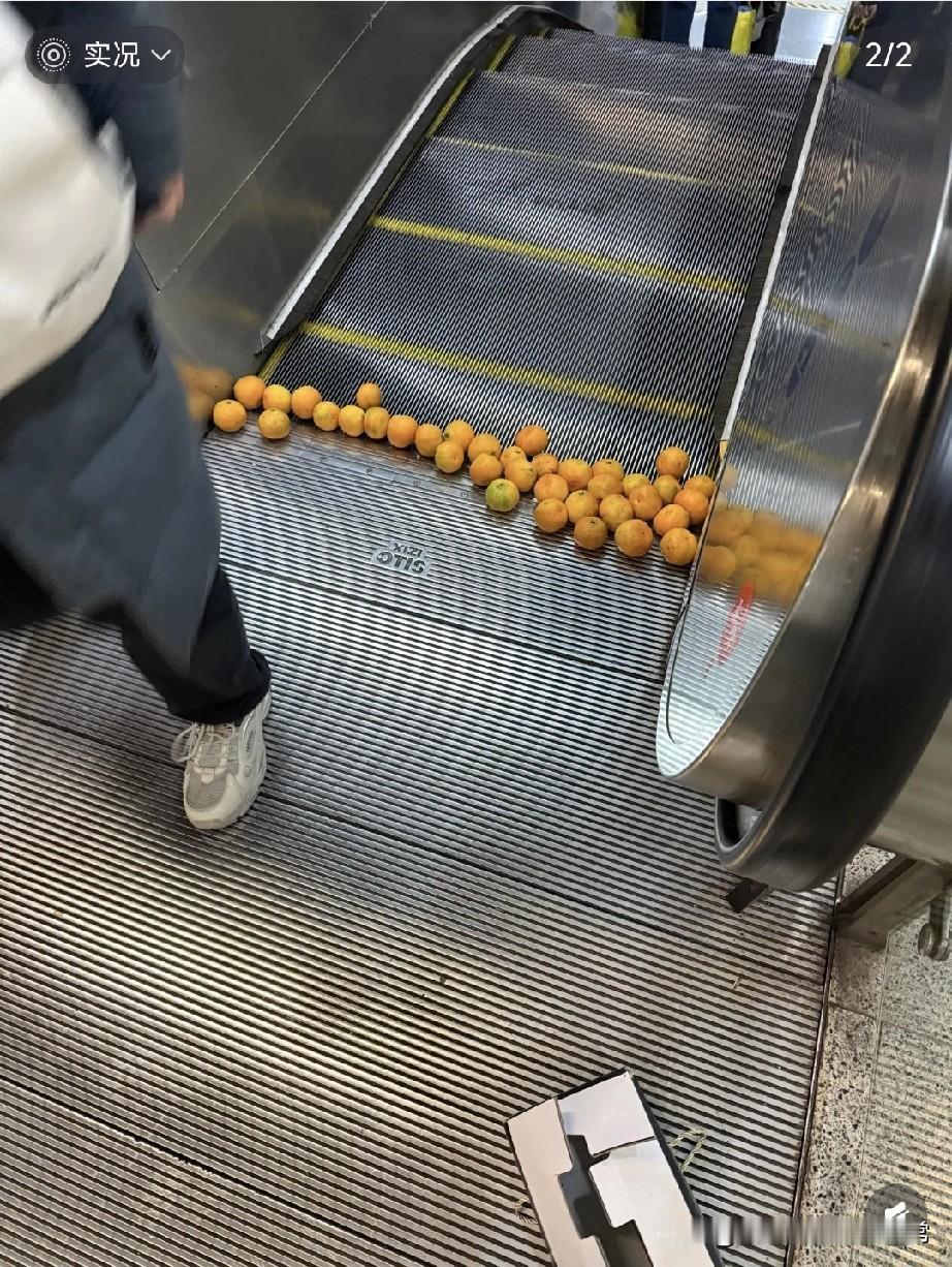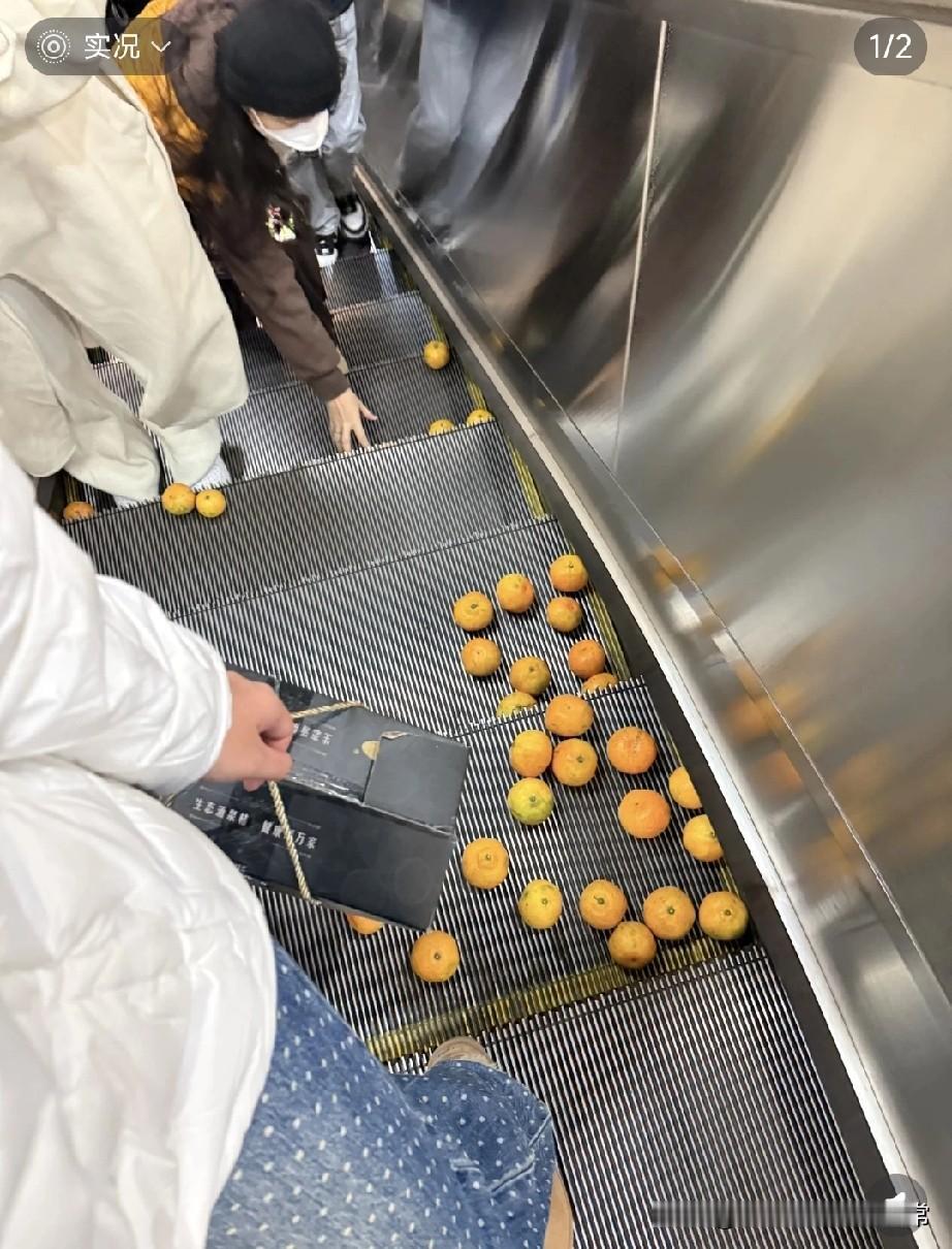 坐扶梯最可怕的事情出现了! 刚提的一箱橘子在扶梯口崩了——黄澄澄的果子“哗啦”全滚上去,我正慌着要追,突然反应过来:这是上行扶梯啊! 果子顺着梯级“哒哒哒”往我这儿滑,后面大姐弯腰帮我捡,前面大哥笑着让我“接好”,没半分钟,撒出去的橘子全乖乖回到脚边,连箱子都没磕坏。 评论区笑疯:“扶梯:这活儿我熟”“比请个搬运工都稳”,但也有人急了:“这多危险!万一有人踩滑咋办?” 说实话,当时光顾着乐了,现在想想确实后怕——你要是遇到这情况,是先捡橘子还是先护着安全?
