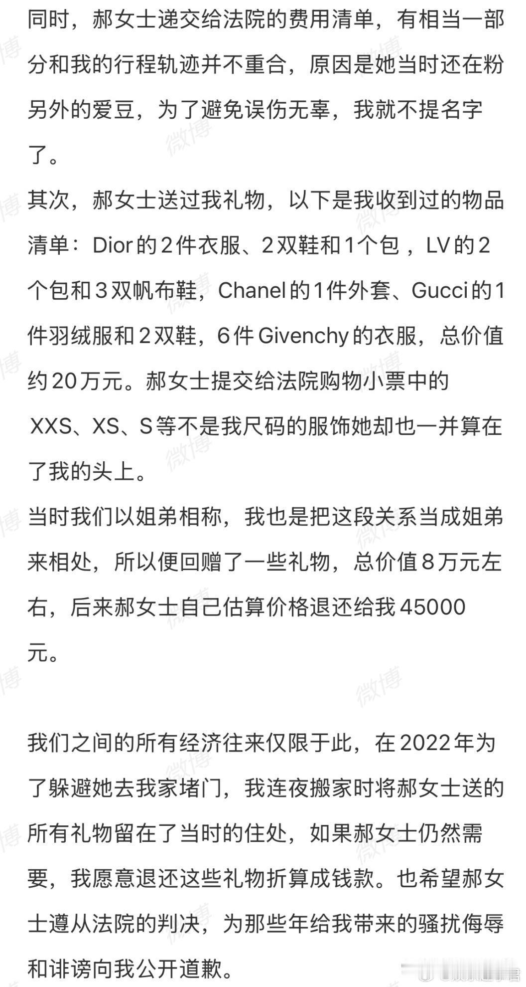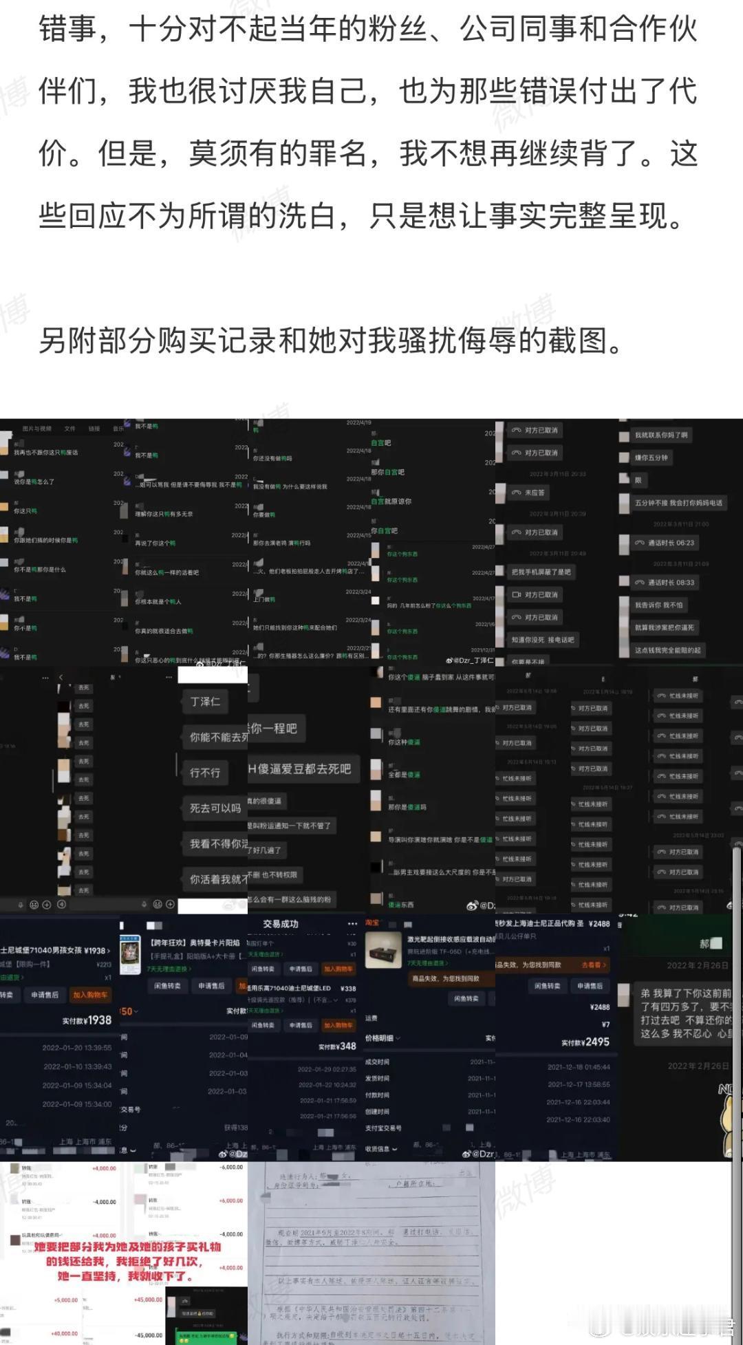 22日,丁泽仁再发文回应“唯一的姐”相关争议,丁泽仁否认对方为他花了300万,并表示他愿意退还礼物和钱款:“也希望郝女士遵从法院的判决,为那些年给我带来的骚扰侮辱和诽谤向我公开道歉。”