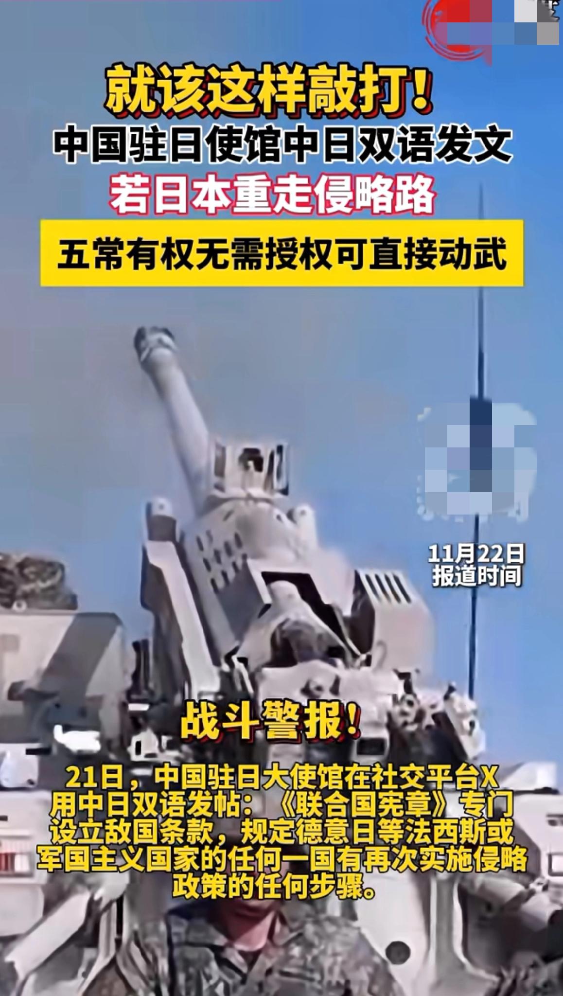 快讯!快讯! 刚刚得知的消息: 11月21日,东方大国驻日本大使馆的一则双语声明,在社交平台引发全网关注!核心就一句话:只要日本敢重走侵略老路,我们有权不经联合国安理会授权,直接采取军事行动! 这可不是吹,靠的是《联合国宪章》的“敌国条款”。瞧瞧如今日本,政客鼓吹“集体自卫权”,军费猛涨,军国主义有抬头之势。咱这声明,就是给日本划红线。 国家此举太明智!既维护和平,又警告日本。咱得支持国家决策,绝不让军国主义死灰复燃。大家说,面对日本这些小动作,咱还能咋做?