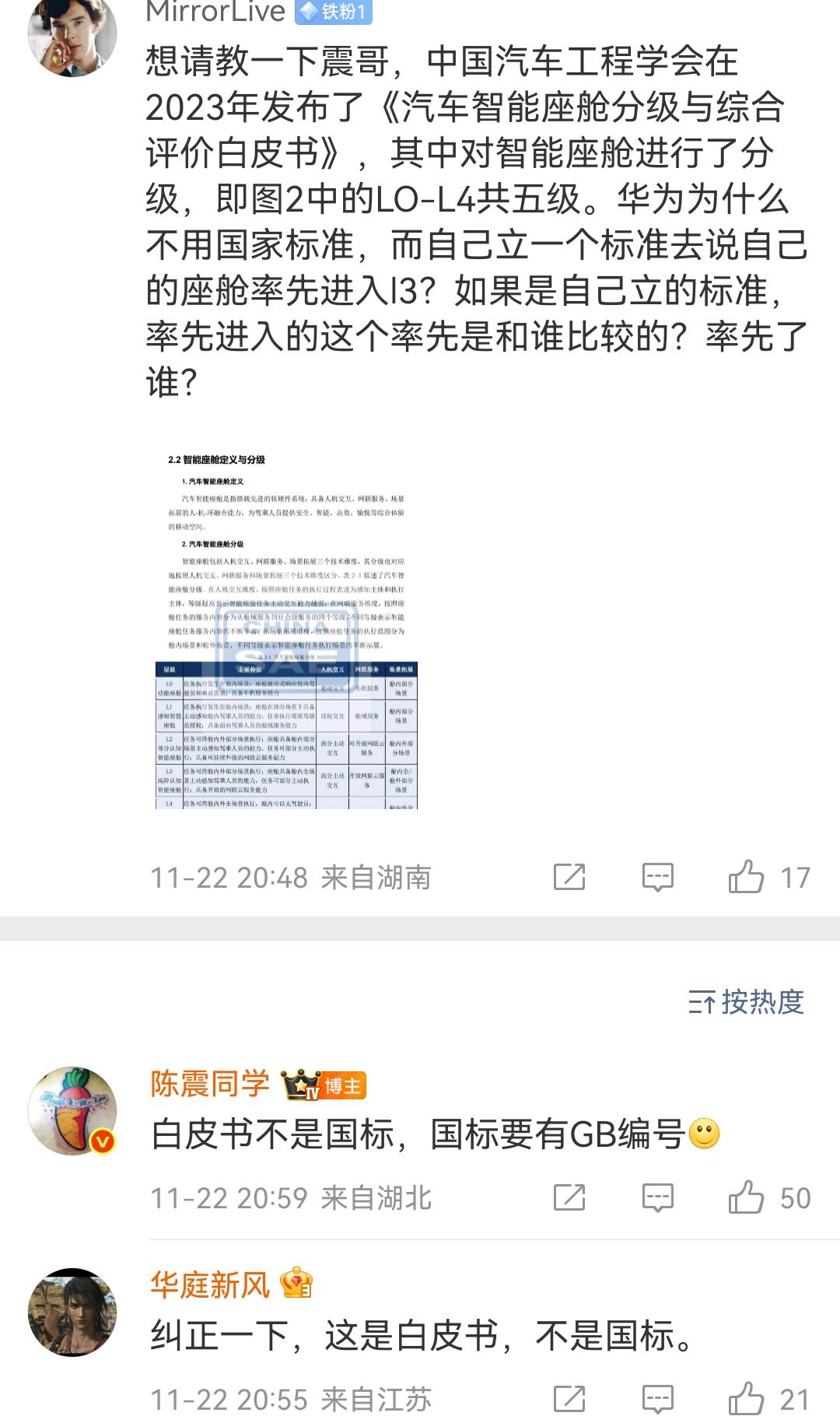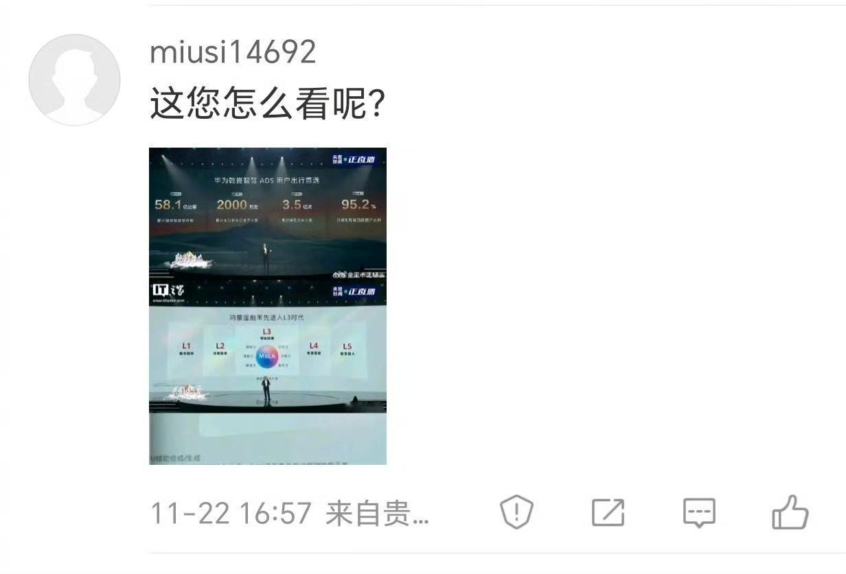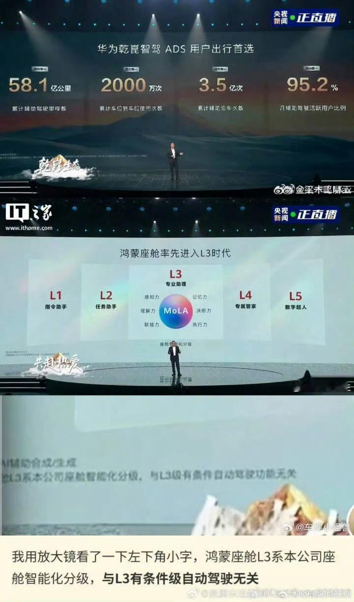 陈震:看啥?您是习惯了只看小字不看大字了吗?“鸿蒙座舱”那么大的字看不见?鸿蒙座舱指的是车机,乾崑ADS指的是辅助驾驶,您的截图不是写的很清楚了吗?另外我和靳总一起的直播里,也针对这个座舱智能化的分级,有详细的介绍,感兴趣您可以自己去看看~[微笑] 哦对了,L是Level的意思………任何分级别的东西都可以用L来形容~