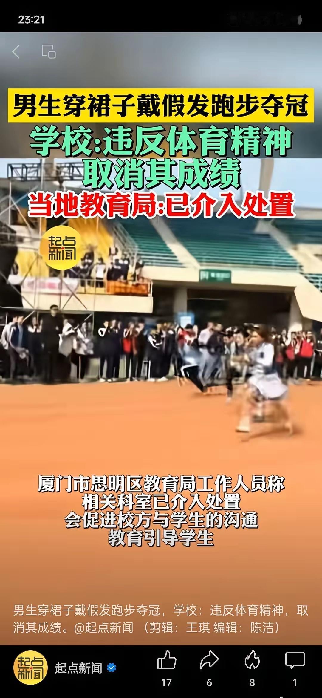 运动会获冠军被取消成绩,你怎么看? 男生穿裙戴假发跑步夺冠被取消成 绩有人说孩子